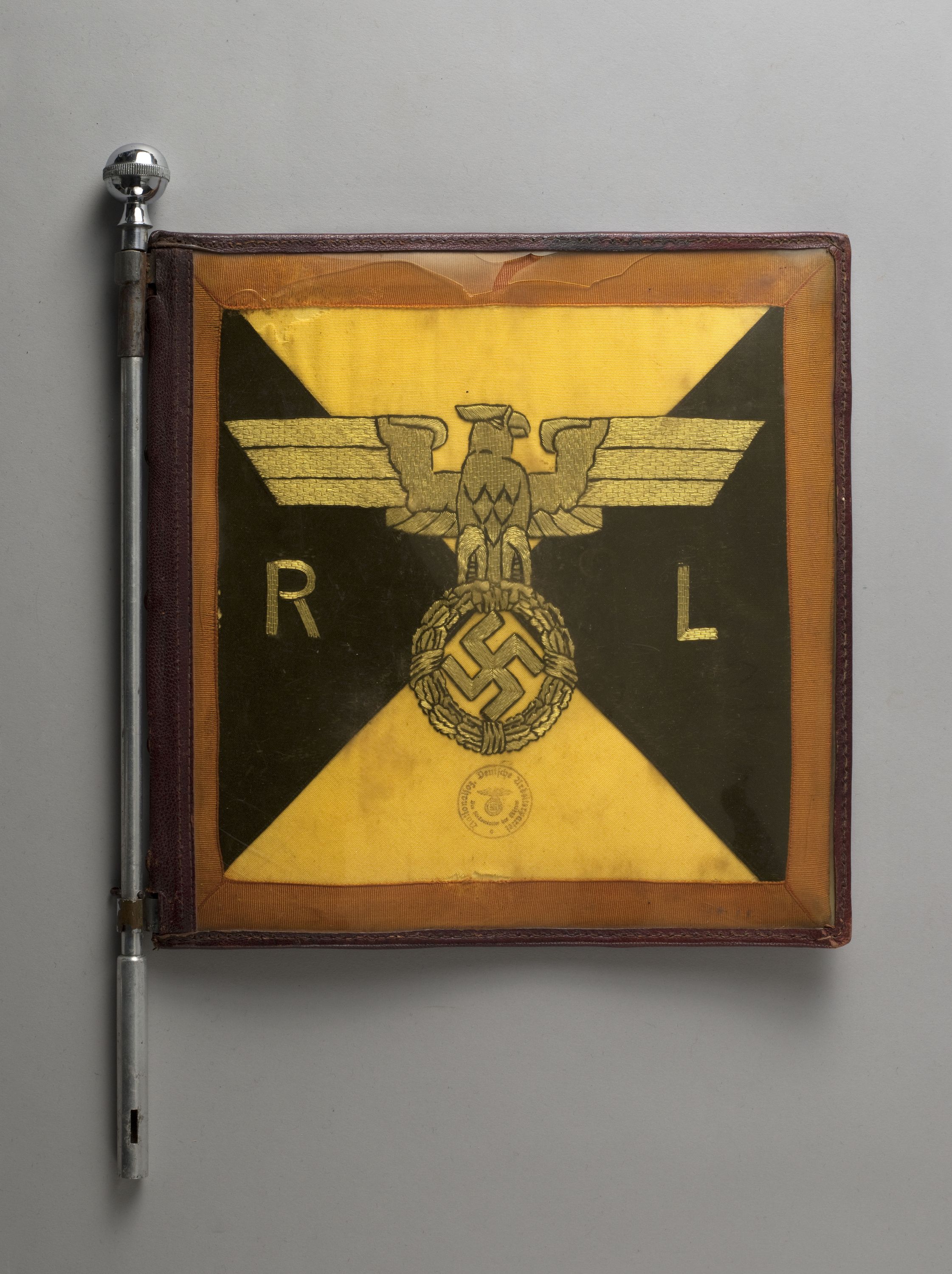 "Fahrzeug Wimpel". Carré (pièce rare : il y a vingt de ces "responsables nationaux", en 1939), hampe en aluminium. Aigle à croix gammée brodé en fils de cannetille d'argent sur fond de deux triangles isocèles blancs (en haut et en bas) et de deux isocèles noirs (à gauche et à droite, de part et d'autre de l'aigle), tenant dans un carré. Tampons avec aigle du parti précoce (sur le triangle blanc inférieur), semblable à celui du "Völkischer Beobachter". Galon rose, (passé au soleil, sans doute rouge à l'origine), courant sur le pourtour du fanion. Le fanion est à l'intérieur d'une sorte de pochette faite de cuir et d'une matière plastique transparente à dominante jaune, fixée à la hampe en aluminium (se terminant par une boule chromée) et fermant par cinq boutons-pressions. Sans doute pris à Berchtesgaden.