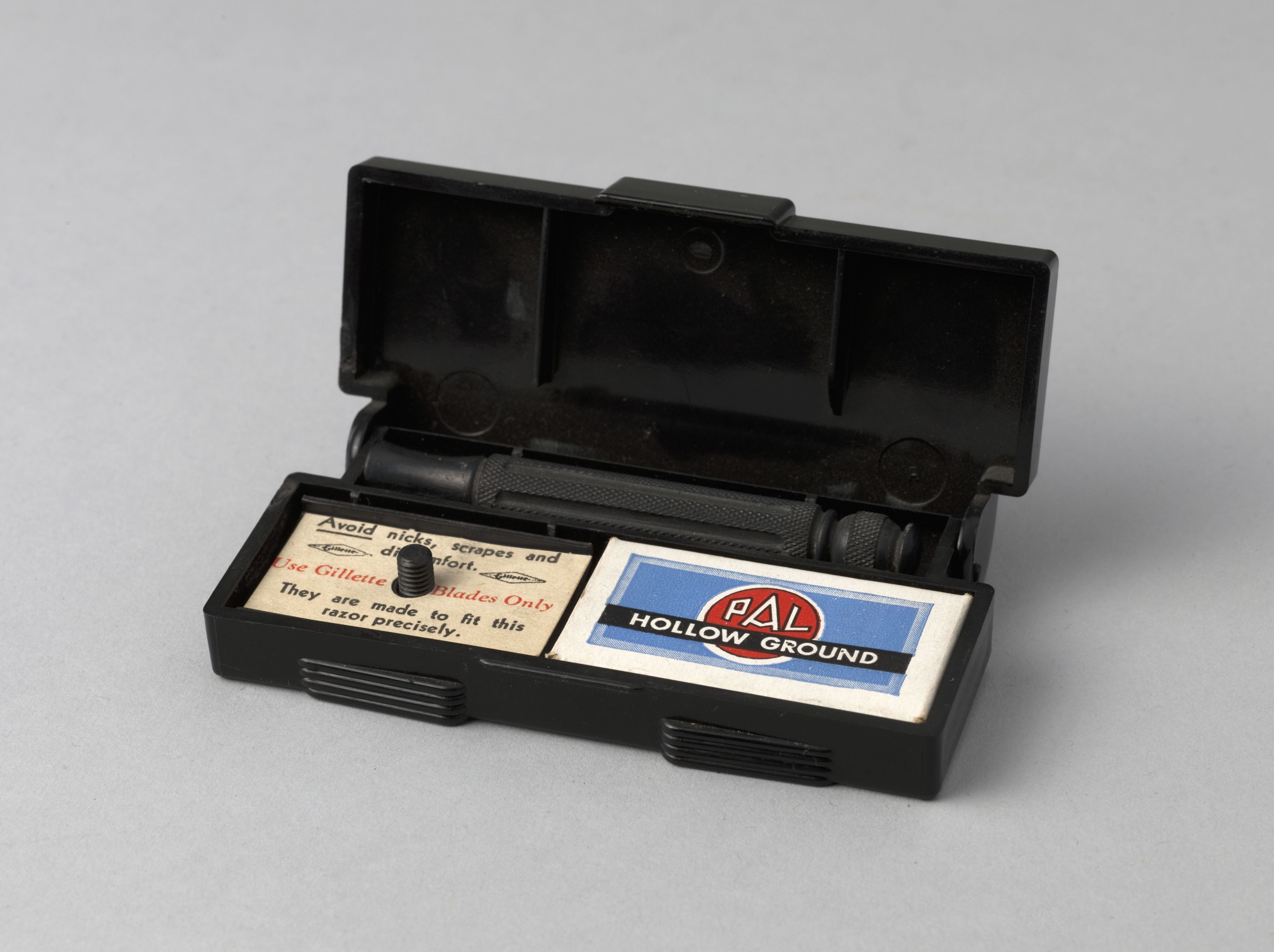 A l'état neuf, dans sa boîte de plastique noir compartimentée, et lames de rasoir "PAL" dans leur boîte de carton. Rasoir en trois parties métalliques, dont deux à visser : manche cannelé et deux parties pour coincer la lame.