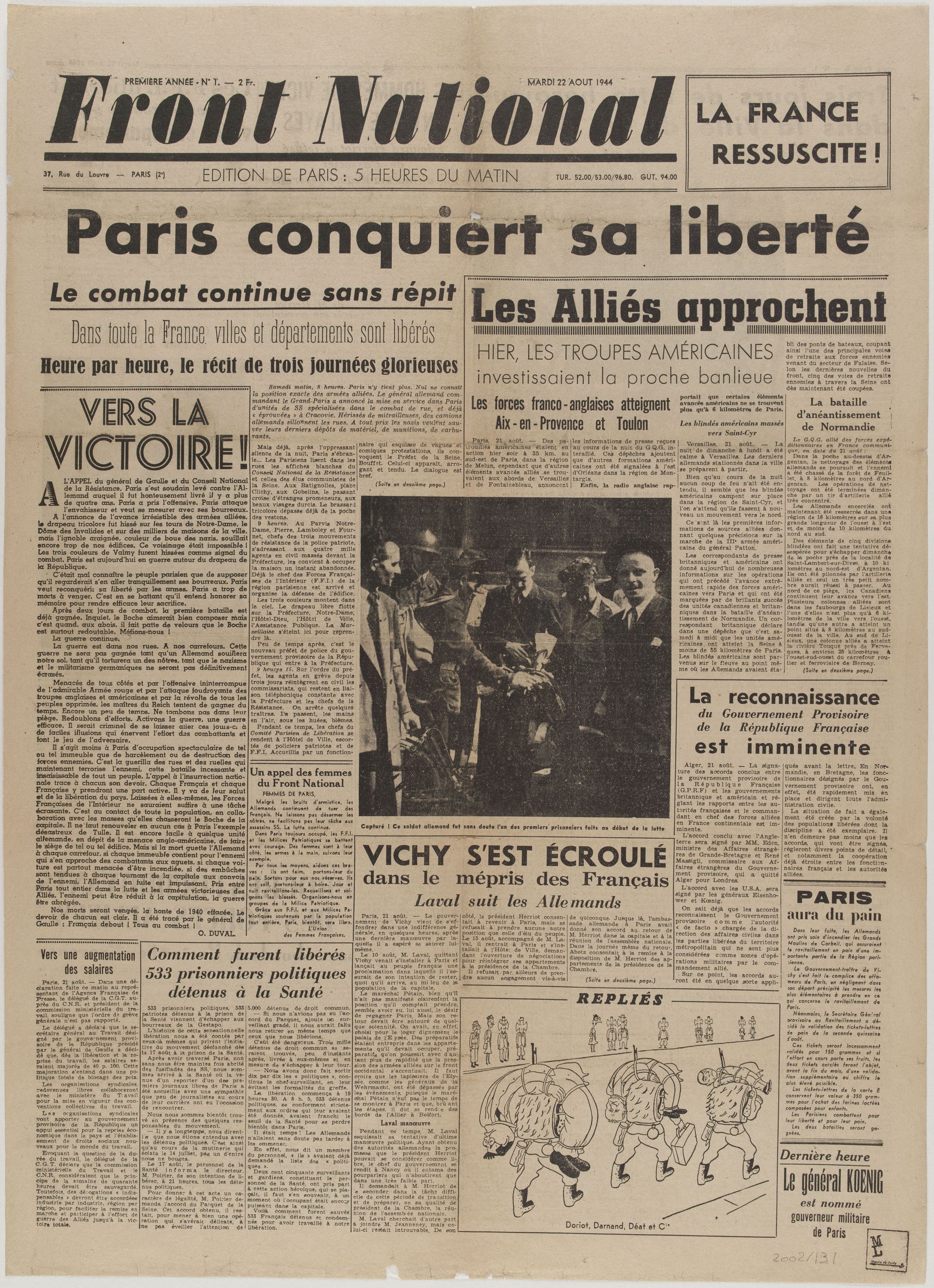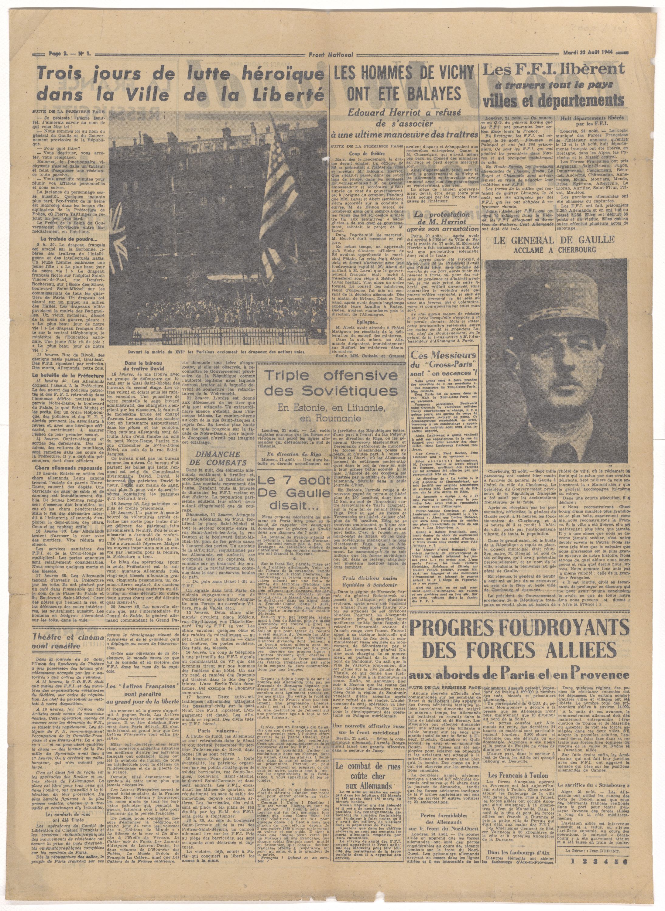Document imprimé recto-verso en noir avec reproductions photographiques. Journal "Front National" (Edition de Paris) n° 1 du 22 août 1944.Titre : "Paris conquiert sa liberté."