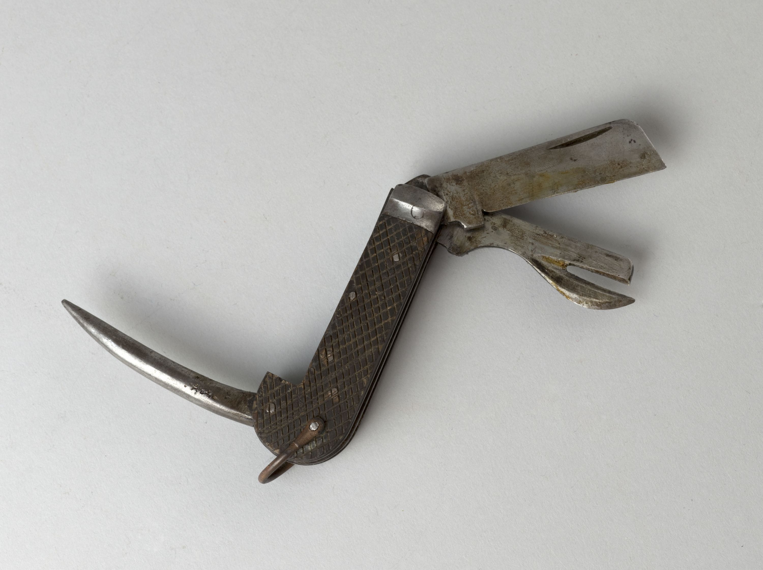 A trois lames : lame, poinçon (marquages illisibles), ouvre-boîte ; plaquettes en corne quadrillées de couleur noire, anneau de cuivre pour dragonne.