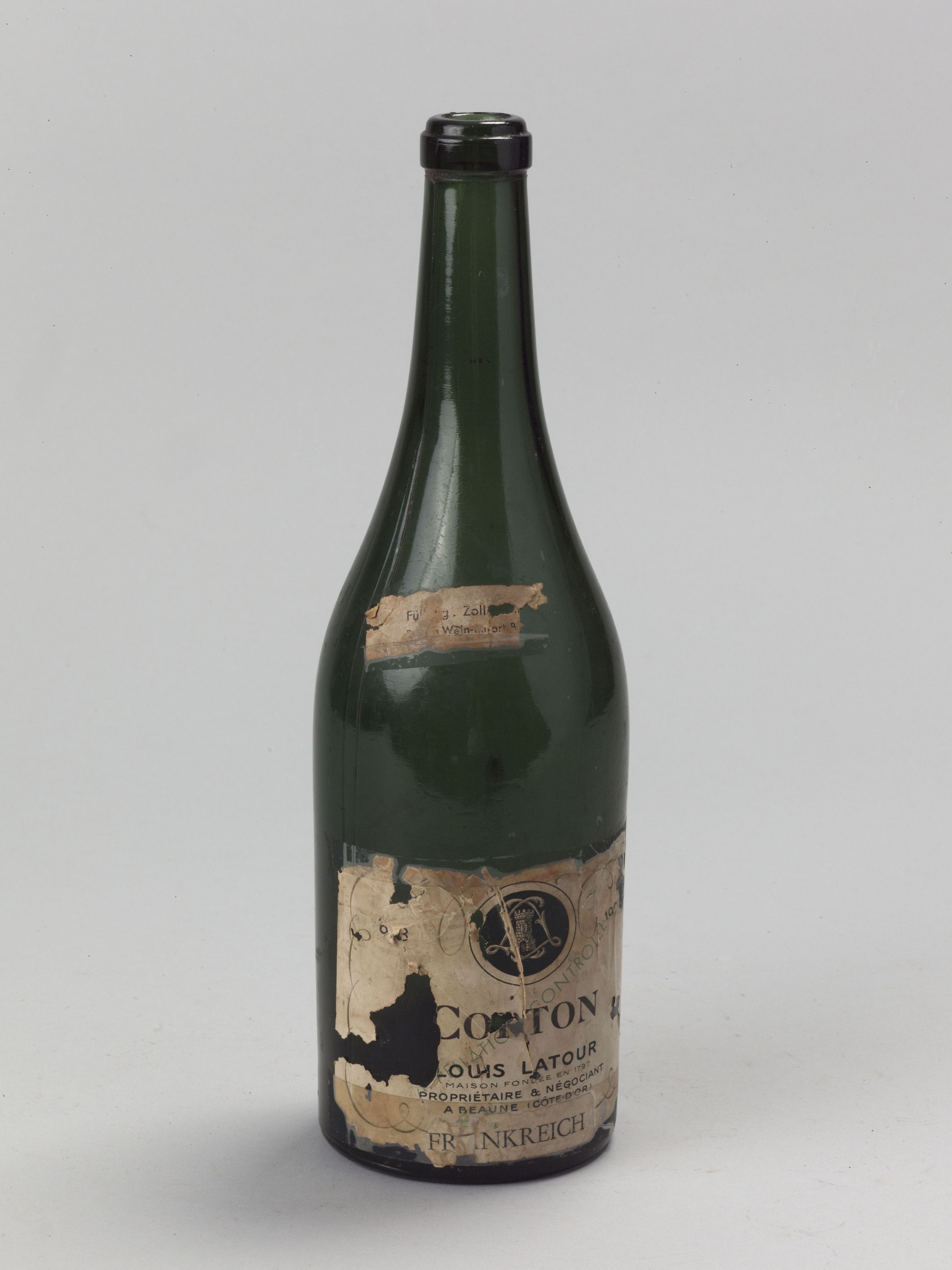 Moulée, forme typique de Bourgogne, étiquette rectangulaire du producteur (partie inférieure), surchargée d'une étiquette de provenance (à coins biseautés), et petite étiquette rectangulaire (partie supérieure) de la douane allemande (pas de bouchon ni de "bague" métallique). Autrefois légendée : "Bouteille de vin de la cave privée du Führer" (?).