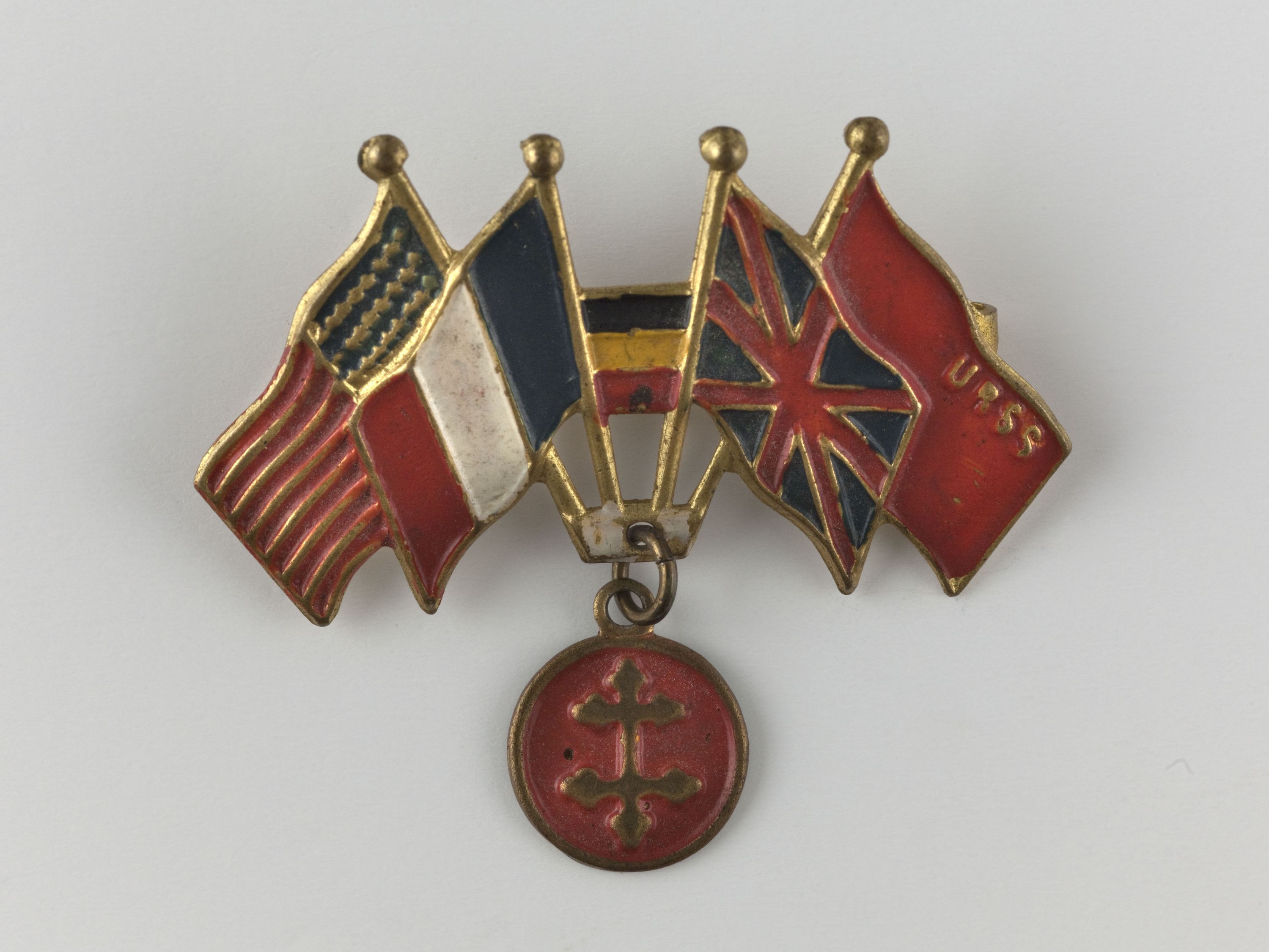 Broche comportant les drapeaux alliés, dont le belge, et une croix de Lorraine