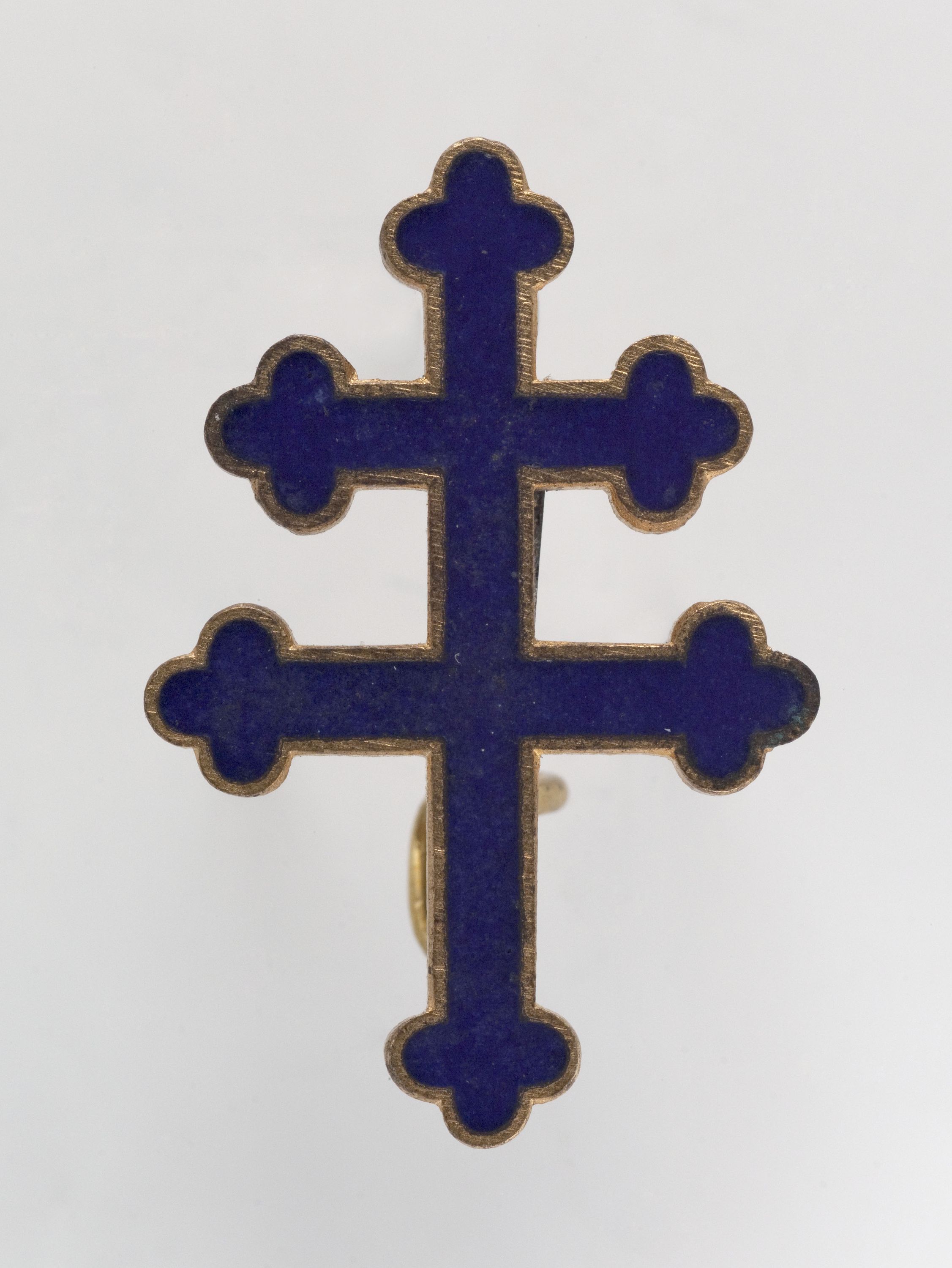 Revers lisse, épingle verticale retenue par une pièce de métal demi-cylindrique soudée.