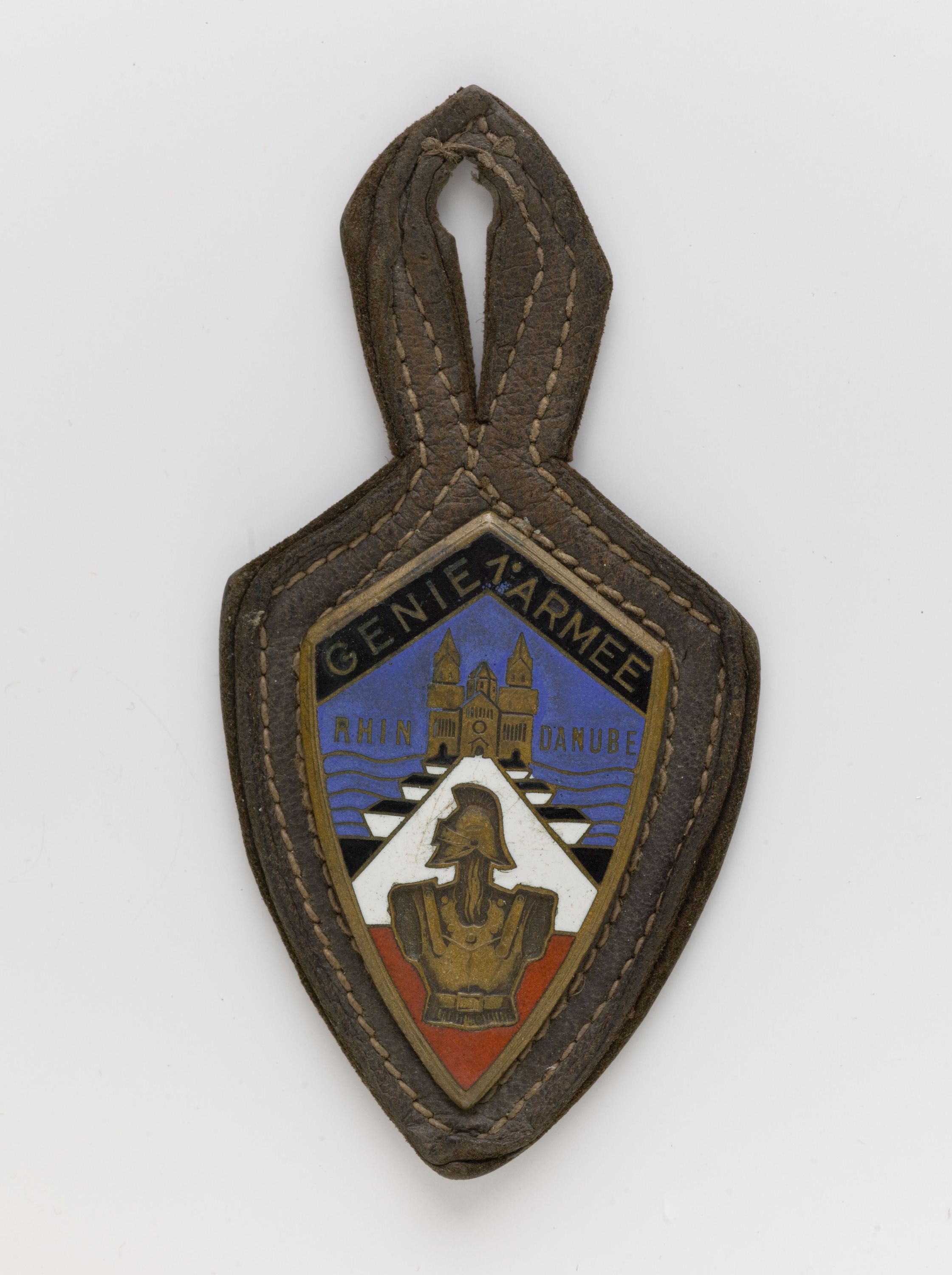 Epingle verticale arrière - maintenue par une pastille arrondie - modifiée en deux pattes métalliques repliées. Patte en cuir de confection locale, boutonnière de suspension intégrée (coutures sur le pourtour de cette dernière et sur celui de la pièce de cuir, doublées en bas, autour de l'insigne).