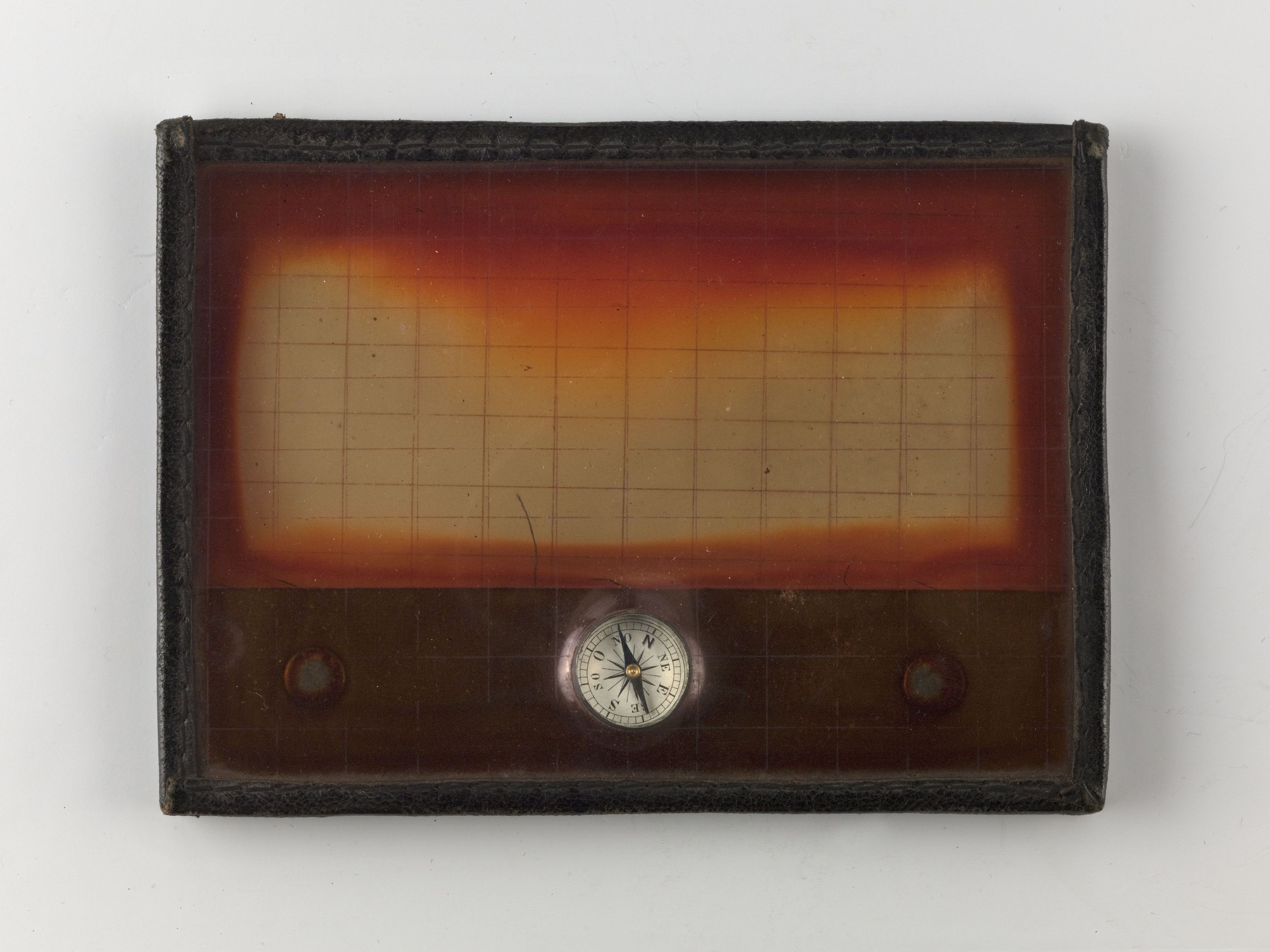 Deux parties rectangulaires transparentes et quadrillées (s'ouvrant comme un portefeuille), entourage de cuir noir, boussole métallique intégrée sur le dessus de l'une des parties, deux boutons-pressions vernis noir et élastique à l'intérieur.