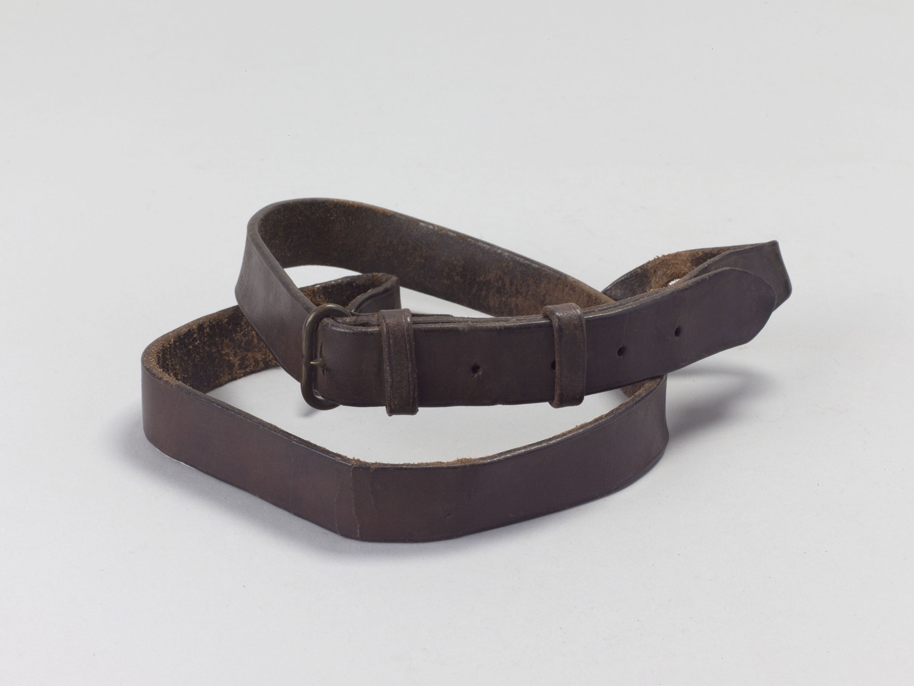 Couleur marron, boucle ovale à un ardillon avec passant cuir (plus un amovible), six positions (trous) possibles, deux rivets amovibles à chaque extrémité ; pas de passant de ceinturon. Le baudrier est à l'origine une bande d'étoffe ou de cuir, ceinte en écharpe, servant à porter un sabre, une épée, ou soutenir un ceinturon ou une ceinture. http://fr.wikipedia.org/wiki/Baudrier (06/11/2013)