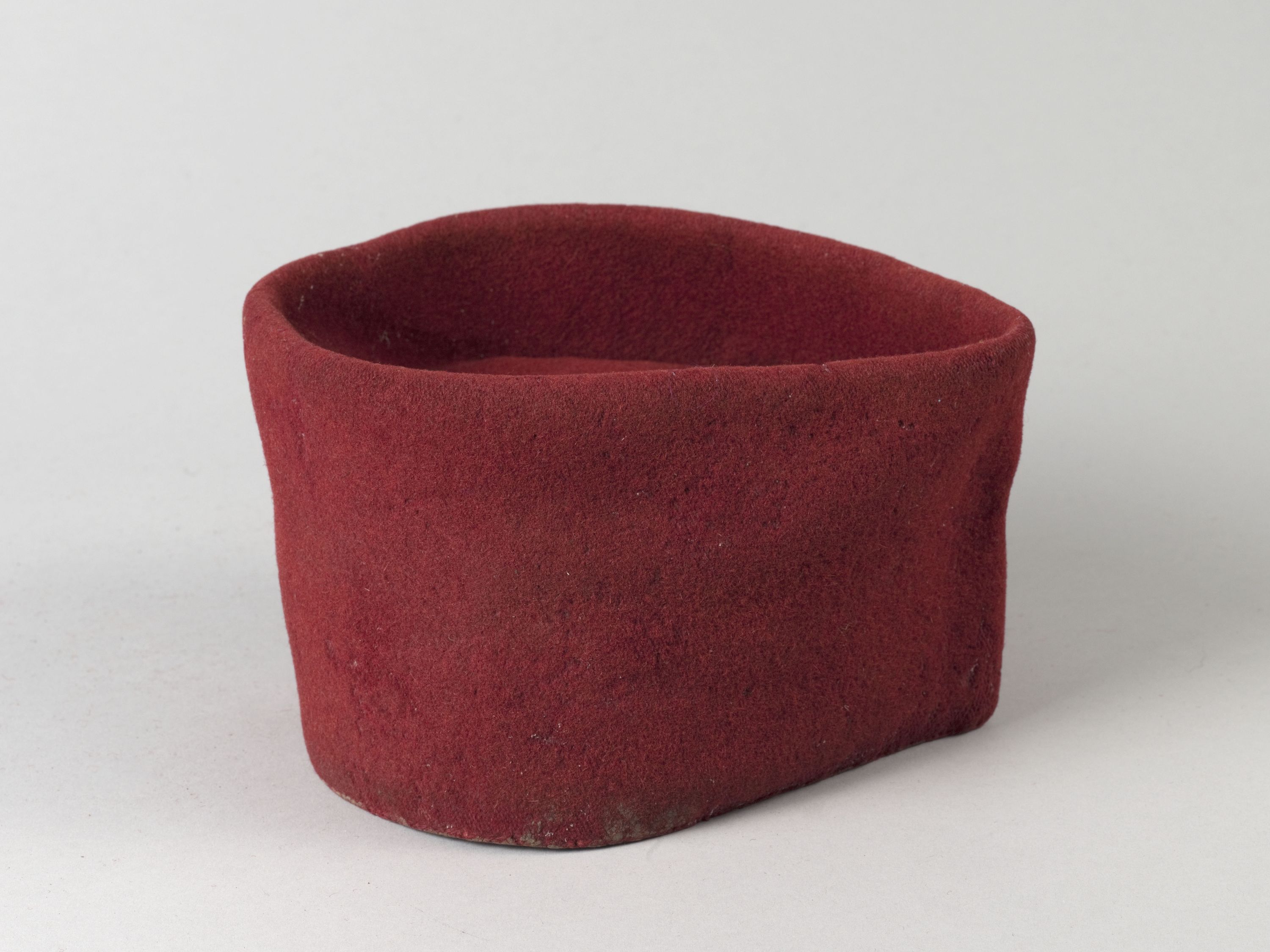 En tissu de laine feutré, couleur cramoisie tirant sur le pourpre, pourtour intérieur en basane décousu.