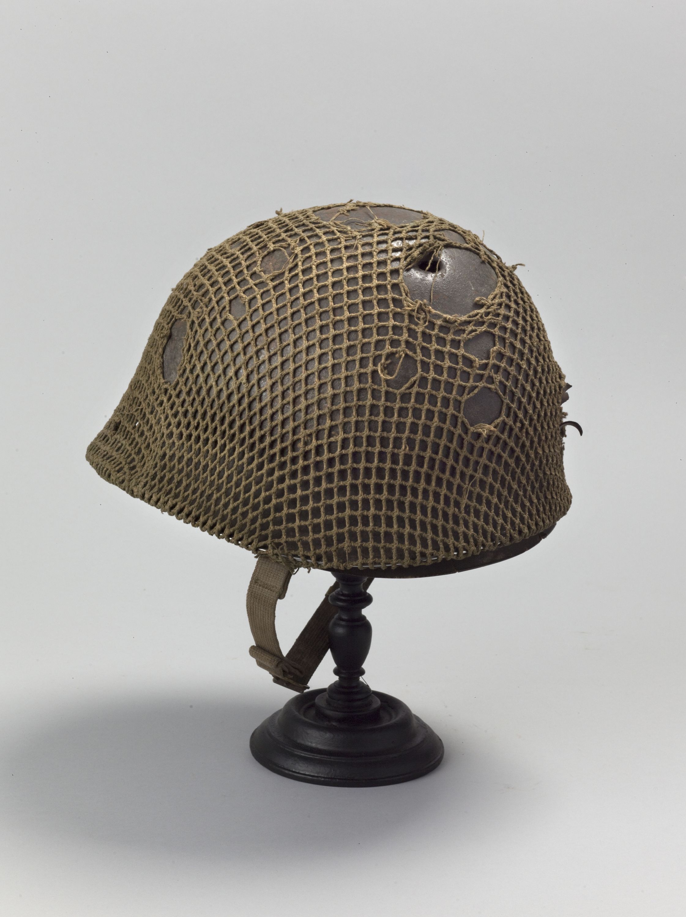 Complet avec son filet de camouflage (ce dernier, apparu avec la tenue M-1943 et tenu par une cordelette blanche à l'intérieur) et l'impact d'un projectile ayant traversé en deux endroits (arrivé sur le haut, arrière gauche et ressorti, toujours sur l'arrière, en bas à droite). Soudure à l'avant, signifiant une fabrication d'avant 1944, pattes de jugulaire soudées fixes, jugulaire en tissu. Liner (sous-casque) avec sa jugulaire en cuir, deux perforations correspondant à celles du casque lourd, sur l'arrière.