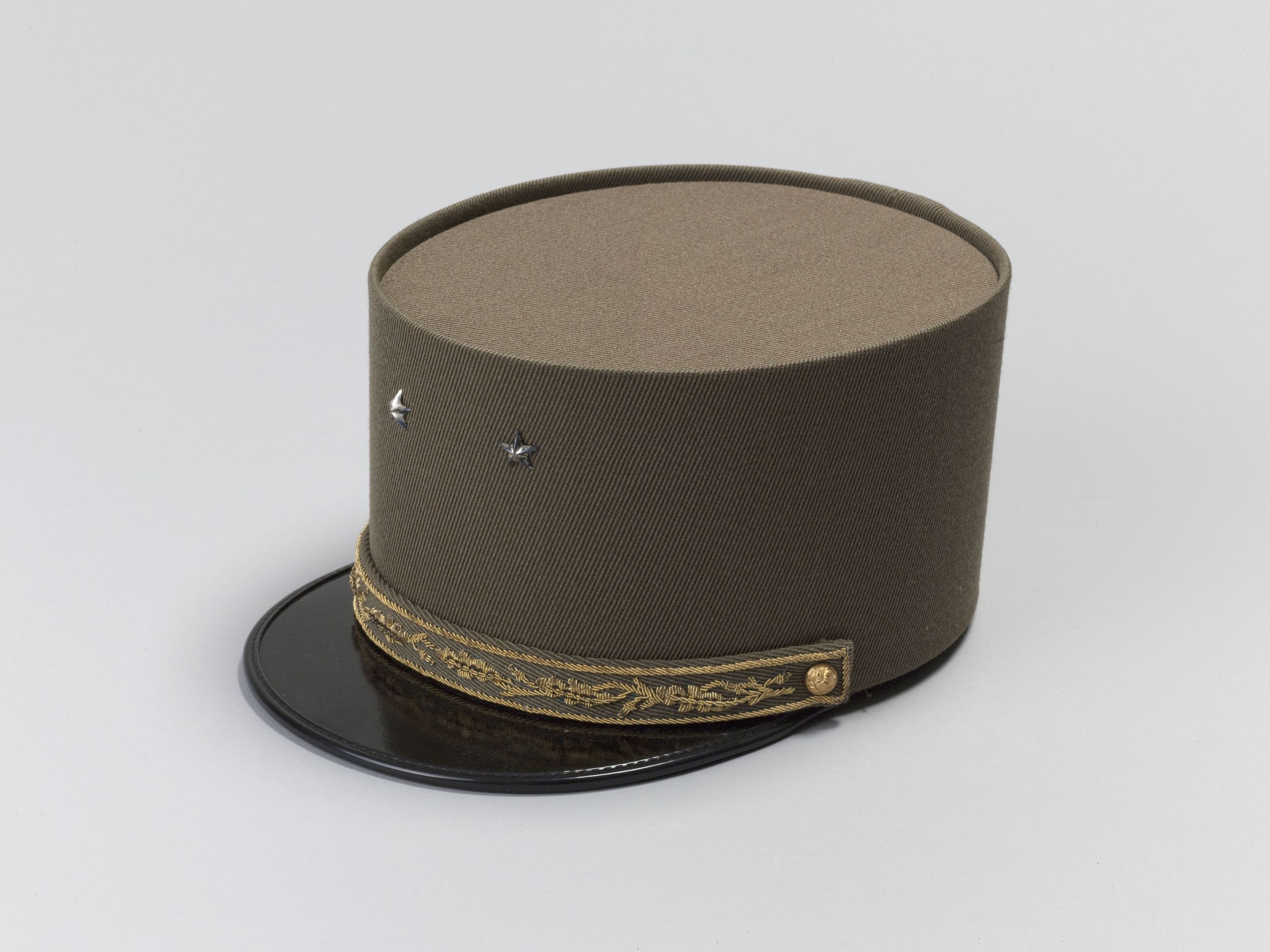 Deux étoiles argent correspondant au grade, étiquette rectangulaire du tailleur collée au fond, à l'intérieur ; pourtour de cuir marron, jonc de la visière en matière plastique.