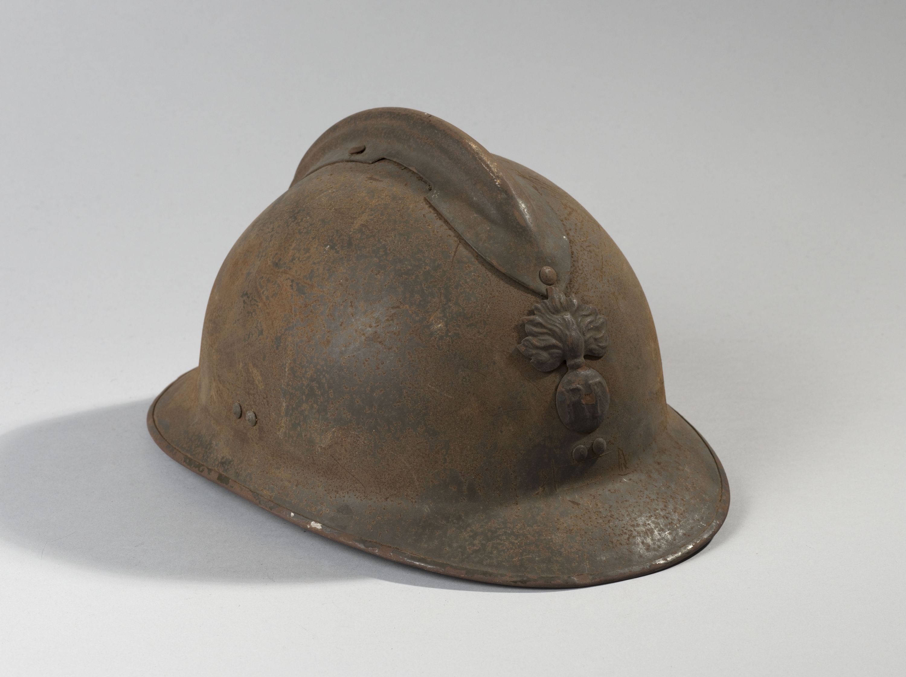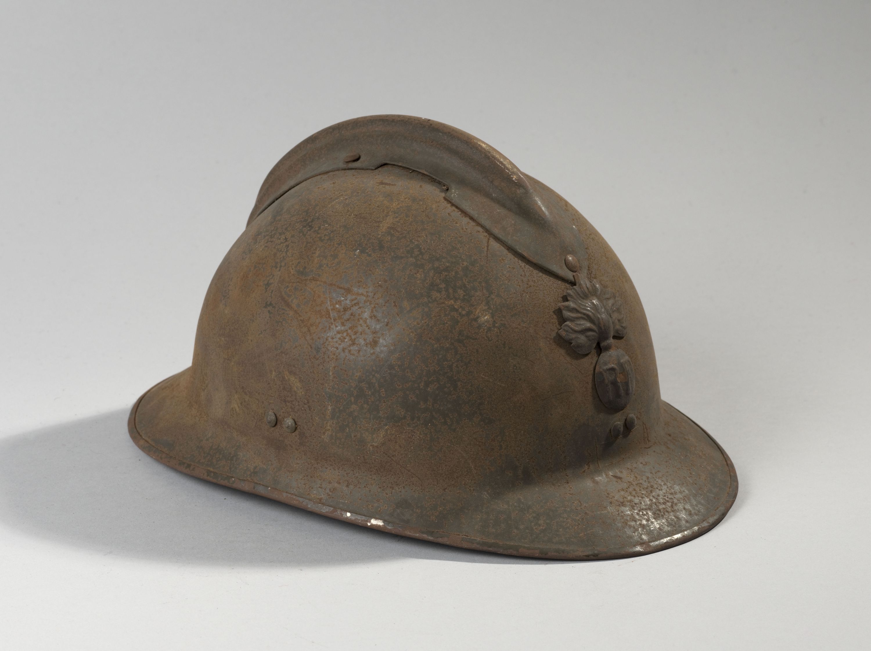 Attribut frontal en métal estampé et découpé Mle 1915 (rectangle - de grade? - semblant avoir été gratté sous la grenade), intérieur cuir avec son lacet ; la jugulaire tressée signale un officier.