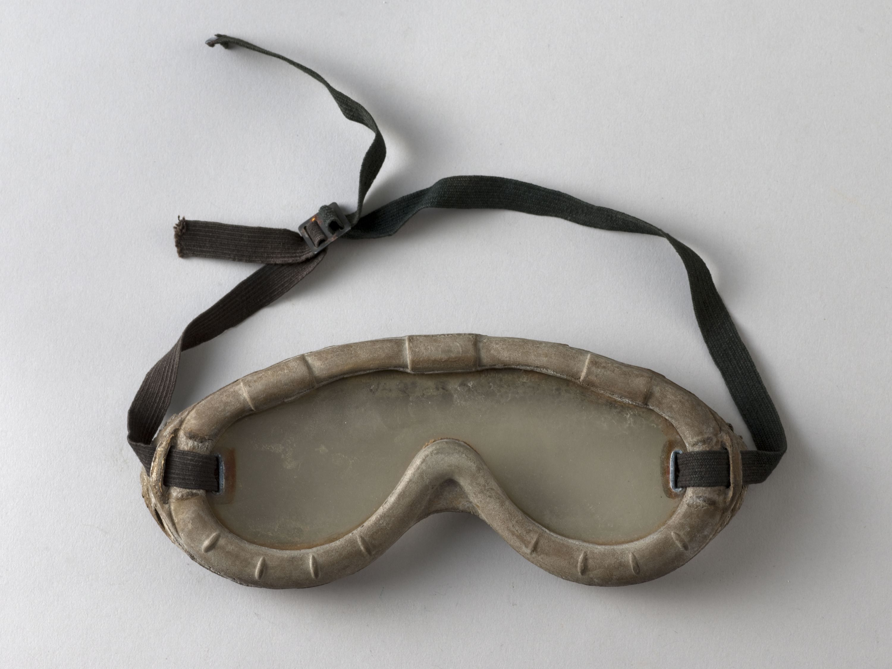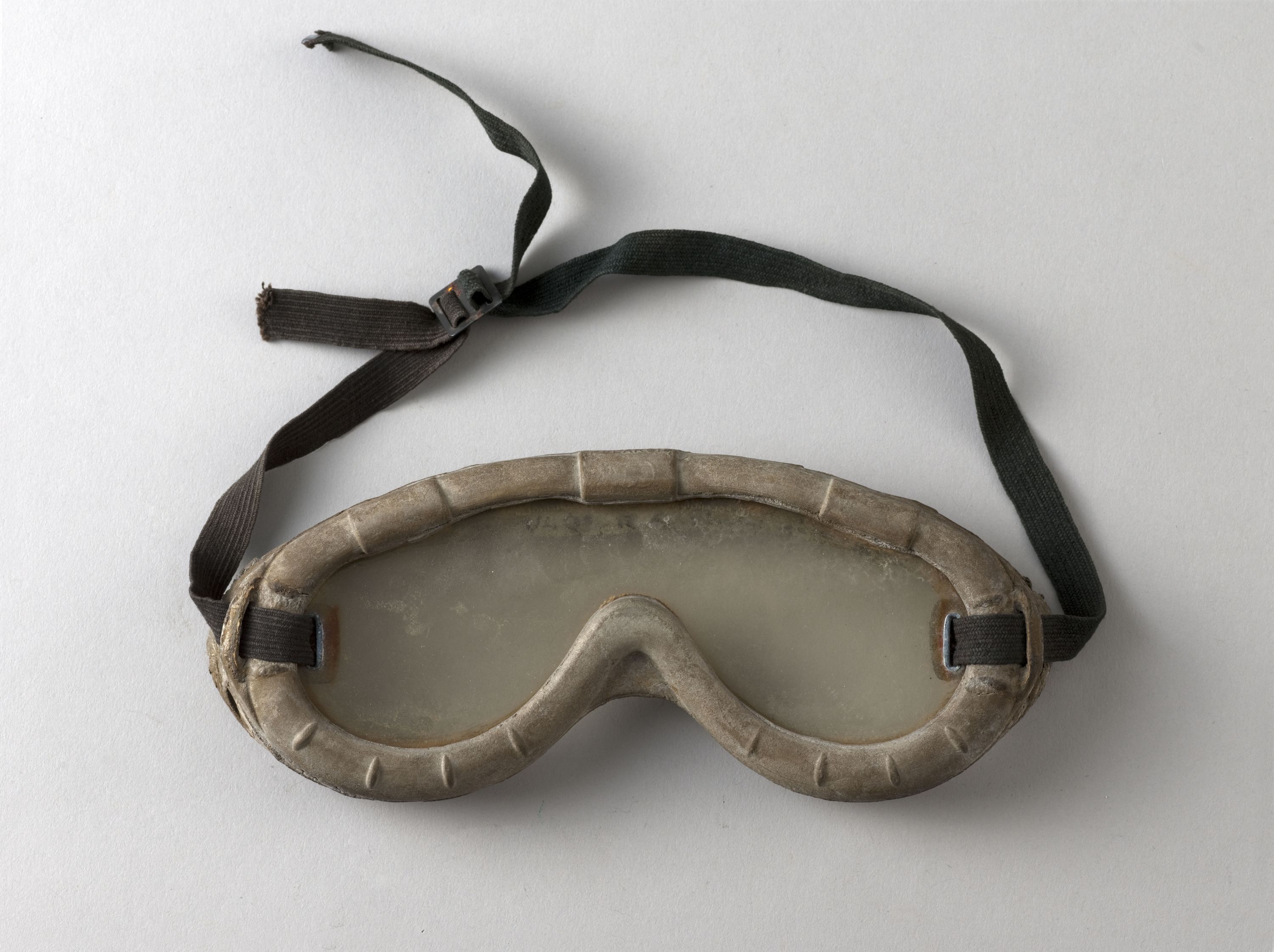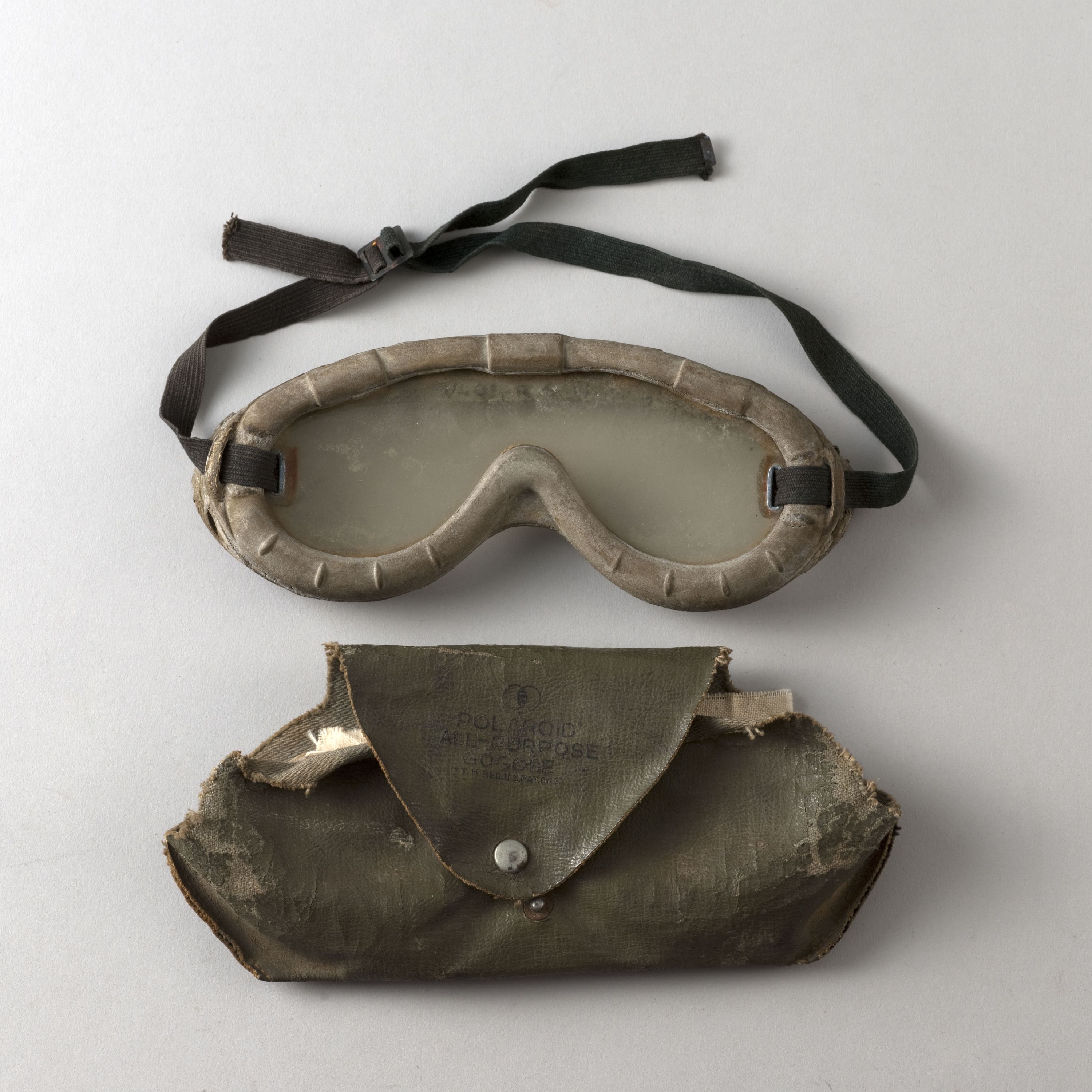"(US) GOGGLES, POLAROID, ALL PURPOSE, TYPE 1021". Lunettes apparues en 1943.Monture en caoutchouc mousse, écran plastique, deux anneaux métalliques retenant un bandeau élastique réglable, grâce à une boucle peinte en noir.