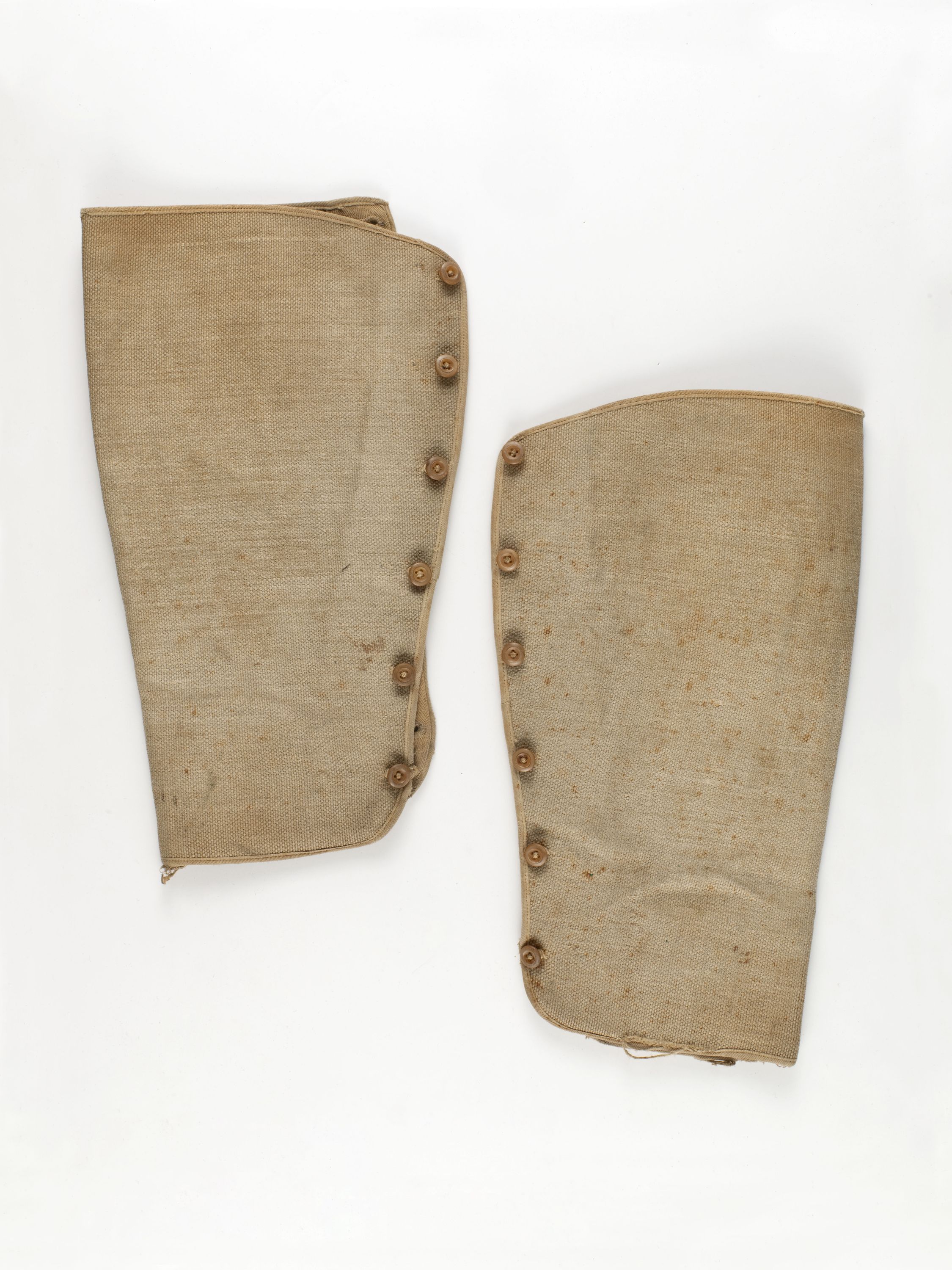 En toile beige, six boutons et boutonnières sur chacune, pour les fermer ; bande verticale de "doublure" au revers.