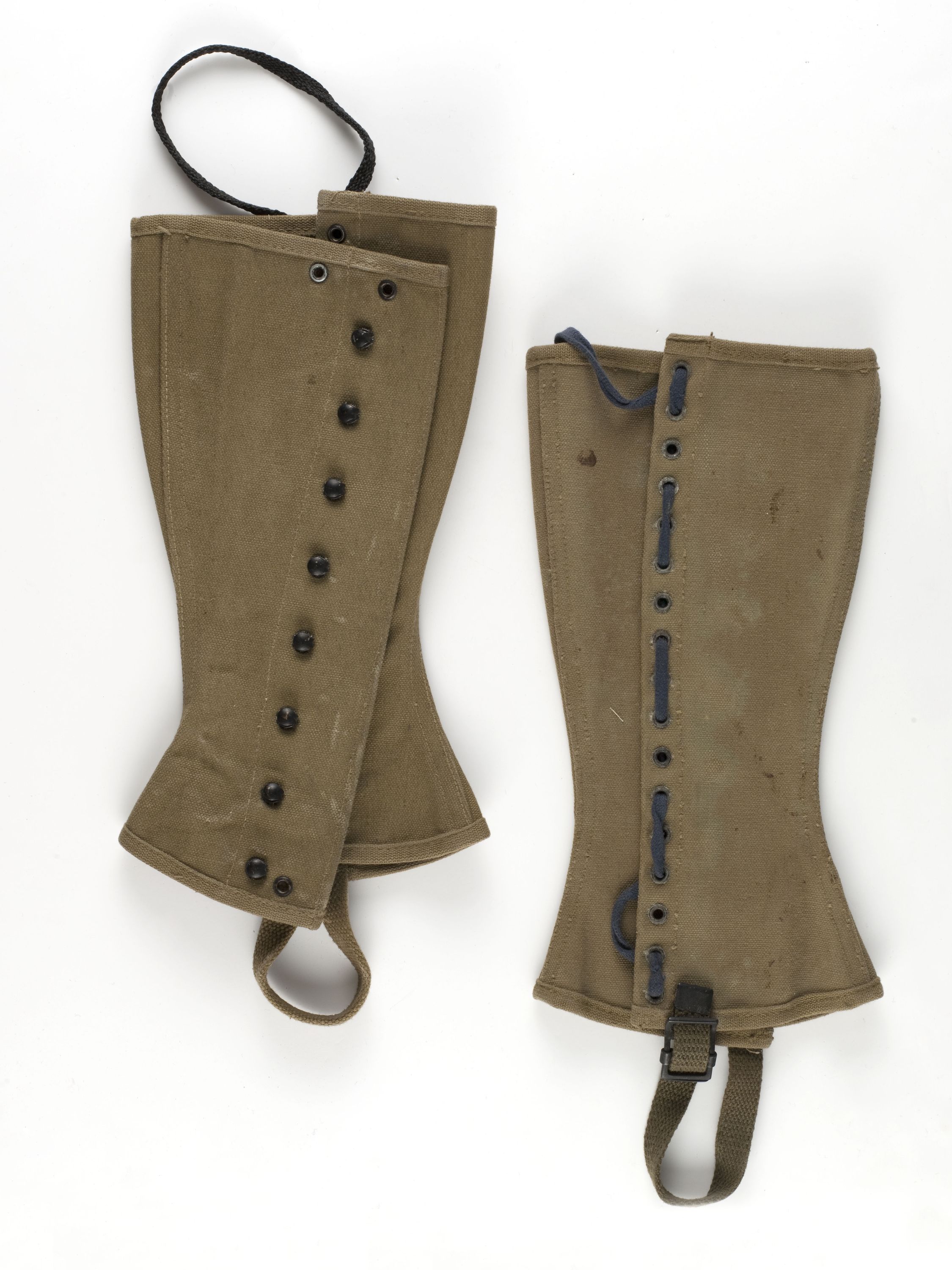 Forte toile de coton kaki clair et crochets en métal noirci. Disponibles en quatre tailles, pour le service en campagne avec les brodequins.
