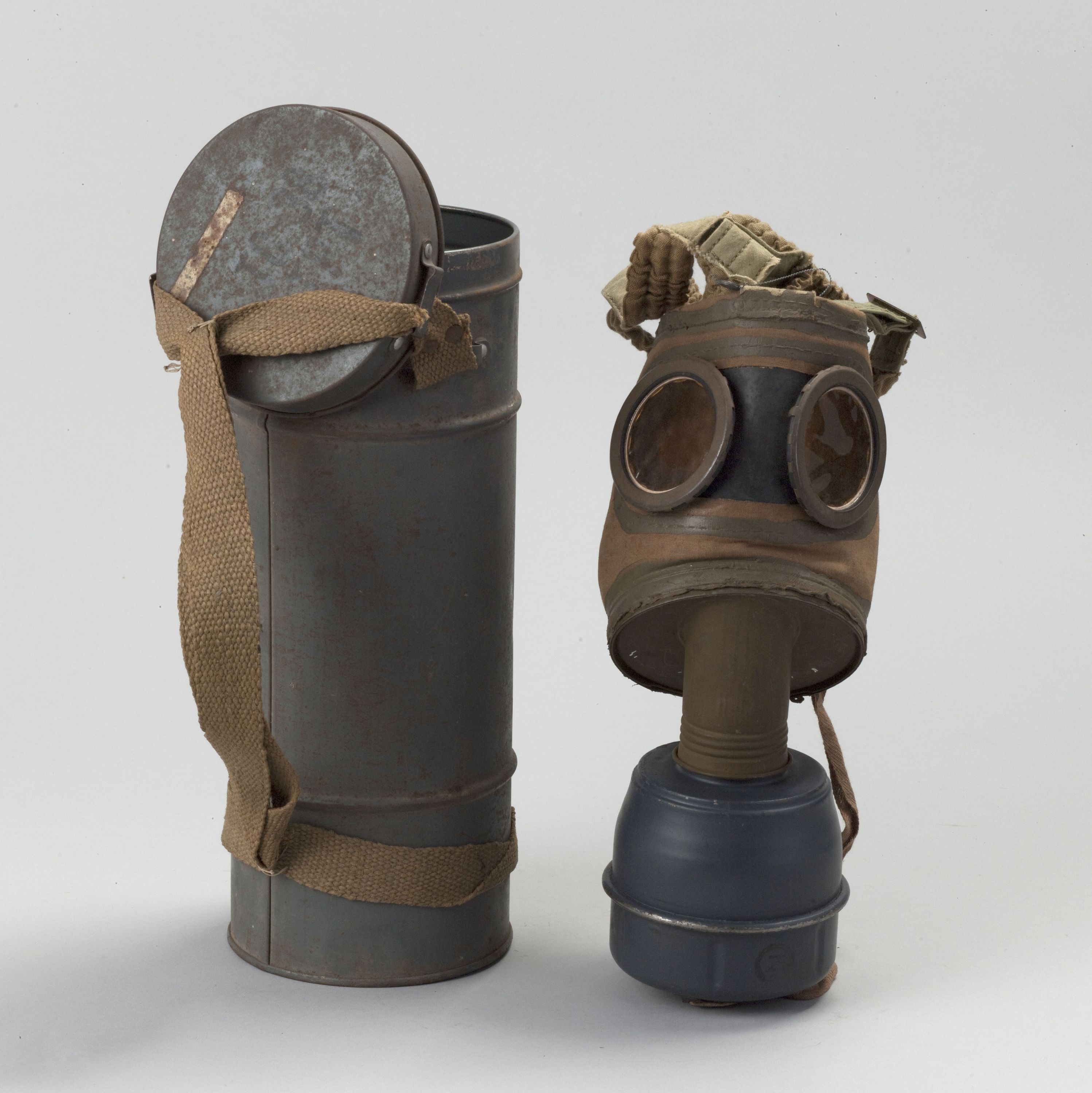 Avec son étui cylindrique métallique muni d'une sangle en fibres, cartouche grise, masque en toile et caoutchouc, plomb sur l'une des sangles.