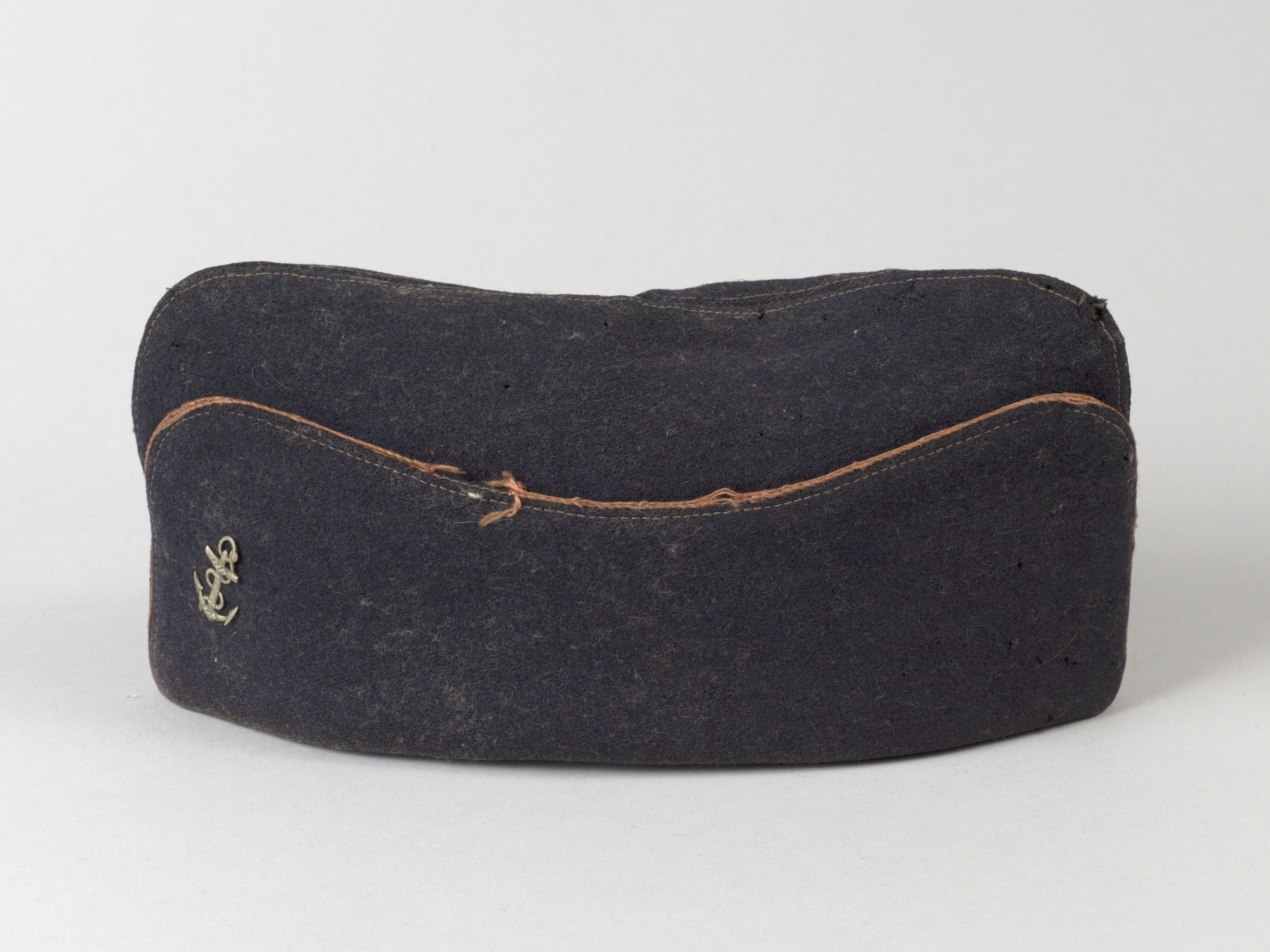 Bandeau et calot en drap bleu, passepoil rouge, pas de croisement du bandeau ni de fond, pas de doublure ni de pourtour, ancre de marine encâblée métallique épinglée sur l'avant (deux pattes métalliques repliées sur l'arrière).