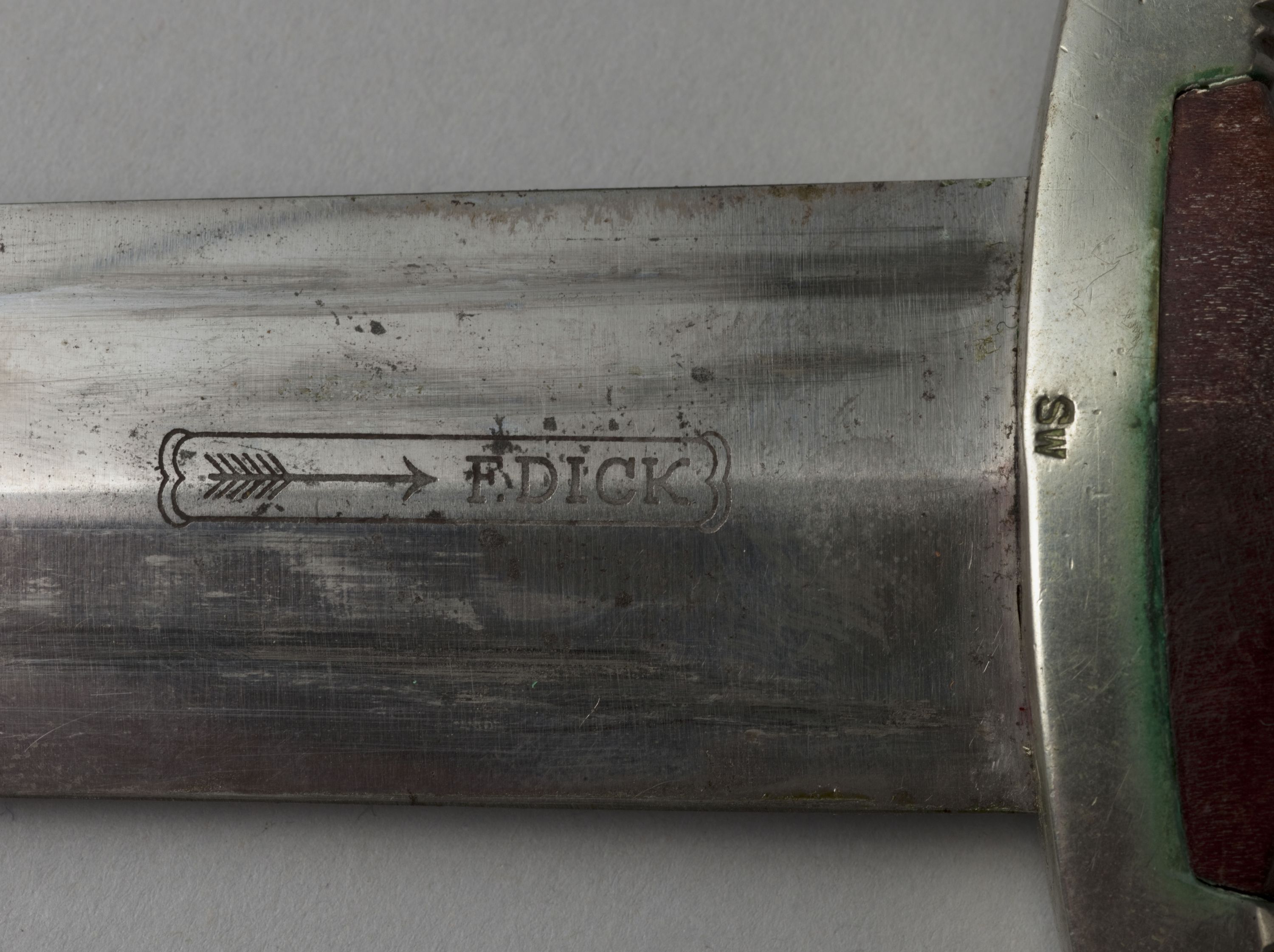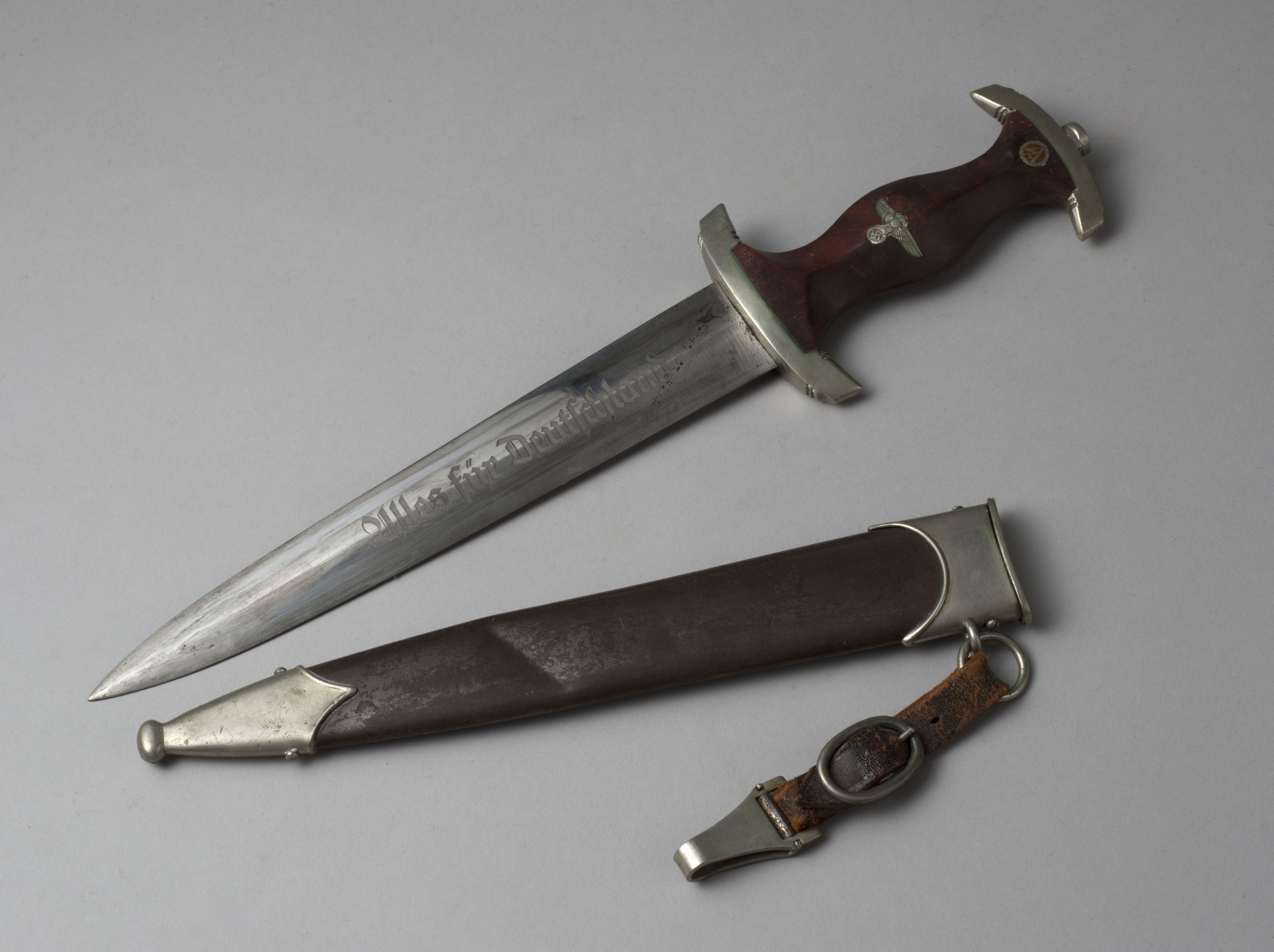Dague de service Sturmabteilung, adoptée en 1933, de fabrication précoce, et son fourreau peint en marron. Fusée bois avec aigle et emblème "SA" émaillé, bélière de cuir réglable accrochée à l'anneau de chape du fourreau et munie de son mousqueton plat. Elle s'accroche au passant de ceinturon, absent ici. Les pièces métalliques de la monture, chape et bouterolle sont en fer nickelé.