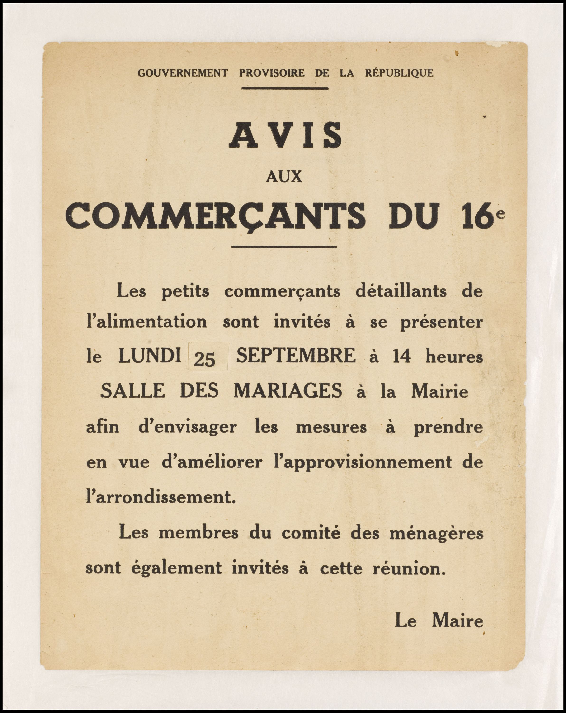 Document imprimé en noir sur papier blanc. Affiche avec un texte du maire du 16ème arrondissement de Paris invitant les commerçants à se réunir pour prendre des mesures afin de faciliter l'approvisionnement.