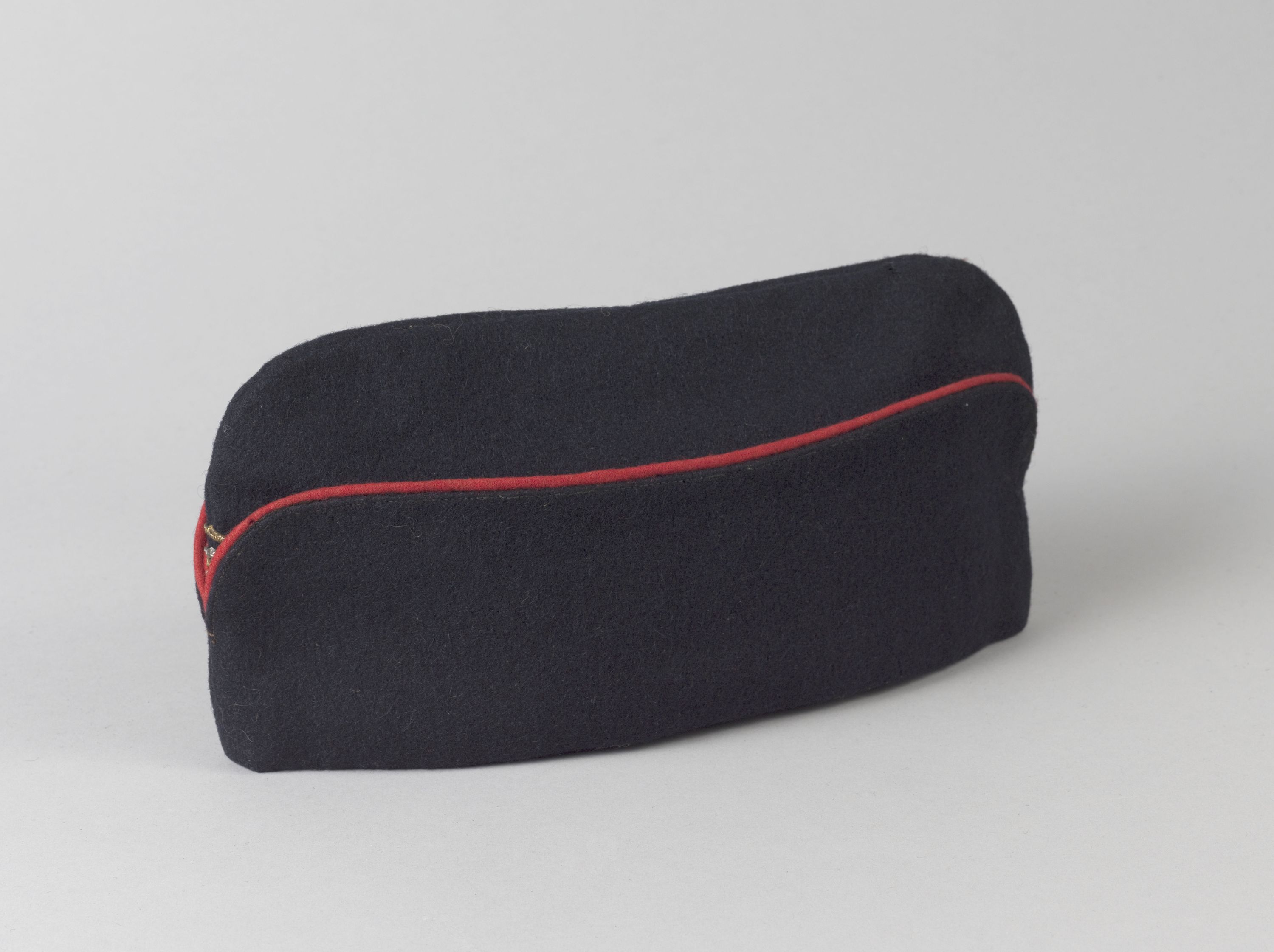Bouton métal or, bandeau et calot bleu, passepoil rouge, pas de croisement du bandeau ni de fond, doublure intérieure noire sans pourtour ; peut-être porté au sein du Régiment de Marche du Tchad.