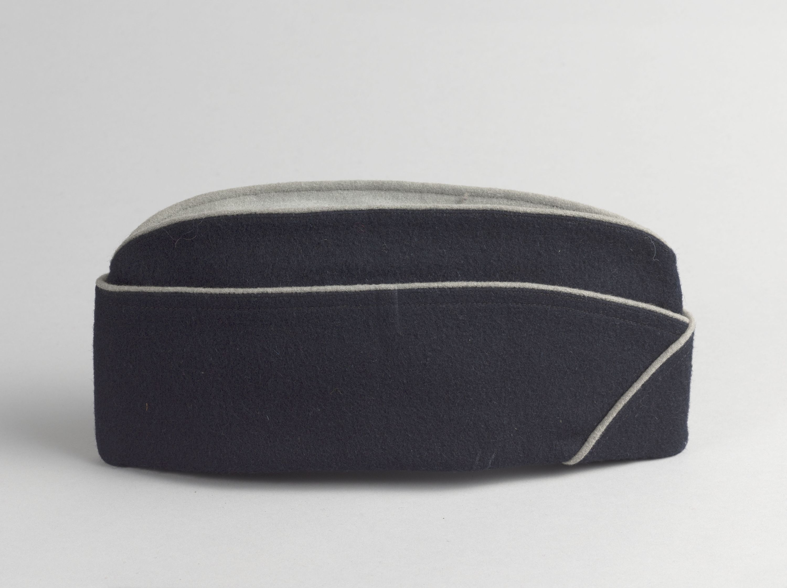 Pour la troupe ; bandeau et calot bleu foncé, fond et passepoil bleu ciel, pourtour intérieur de tissu noir, pas de doublure, étiquette de taille en tissu.