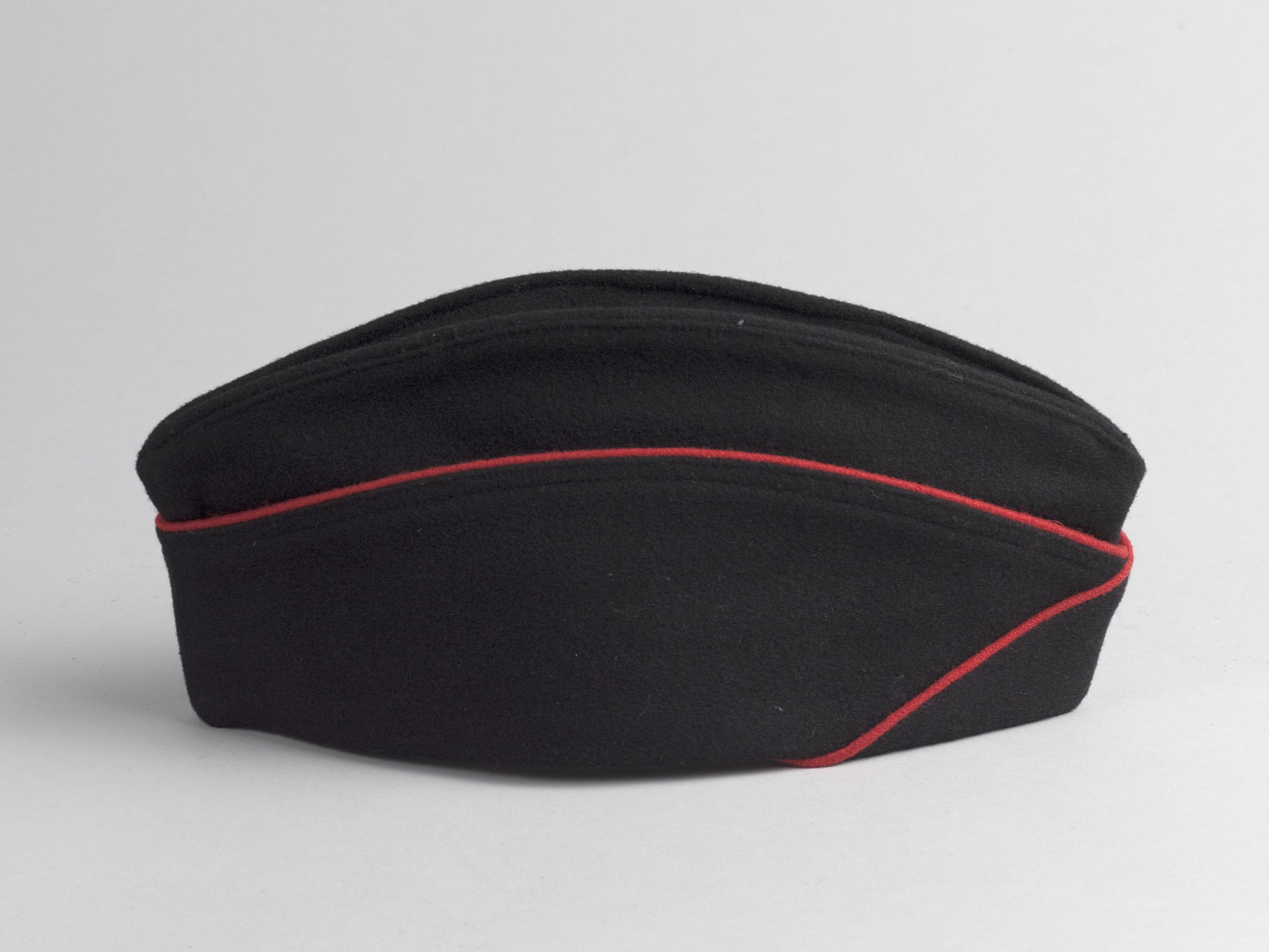 Noir, passepoil rouge, croisement du bandeau, forme "banane", pourtour intérieur en tissu noir, doublure kakie.