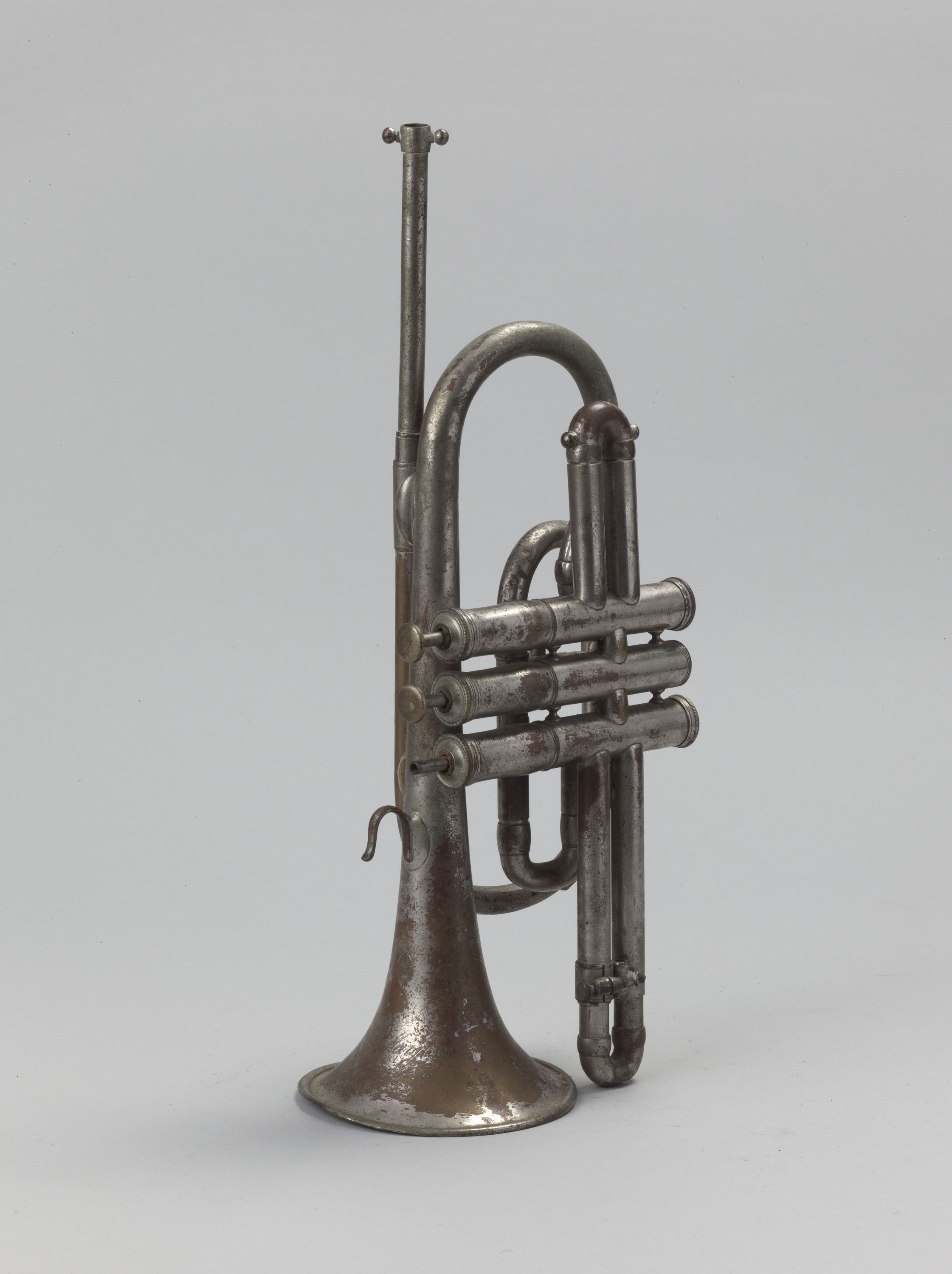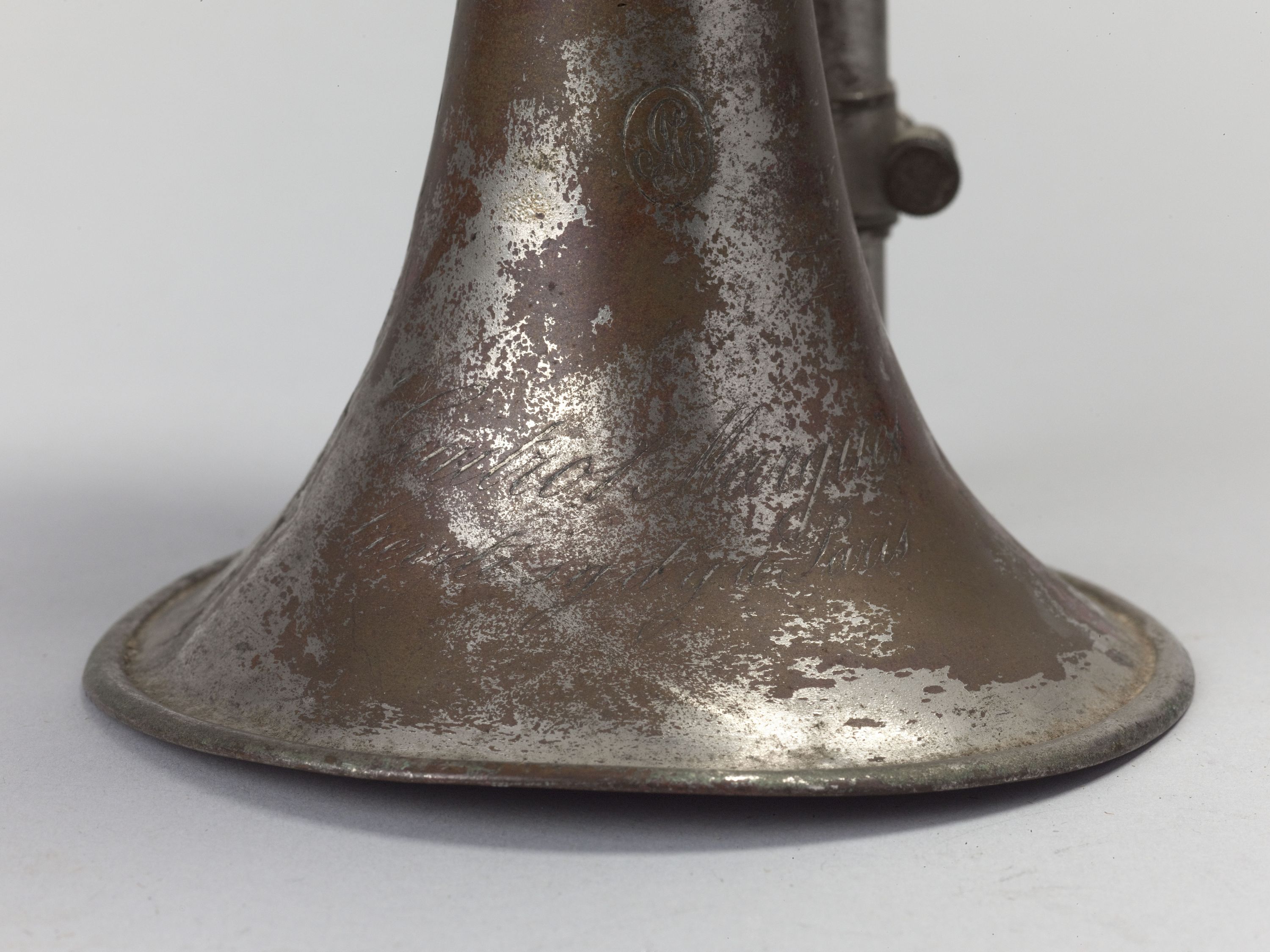 Embouchure absente (ce qui est normal : l'embouchure est très personnelle, chaque artiste a la sienne et le diamètre extérieur de celle-ci est standard pour que chacun puisse mettre son embouchure sur n’importe quel instrument). Manque une touche sur le dessus (piston n°3) et un capuchon à vis du piston du milieu (n°2), en dessous ; réparation avec une espèce de spararap, orifice normal sur le dessous (il manque une clé qui se greffe sur l’axe que l’on voit à côté du trou, avec un petit ressort et un tampon pour le boucher : c’est par là que l’on évacue la condensation en faisant levier avec la clé pour ouvrir le dit trou).