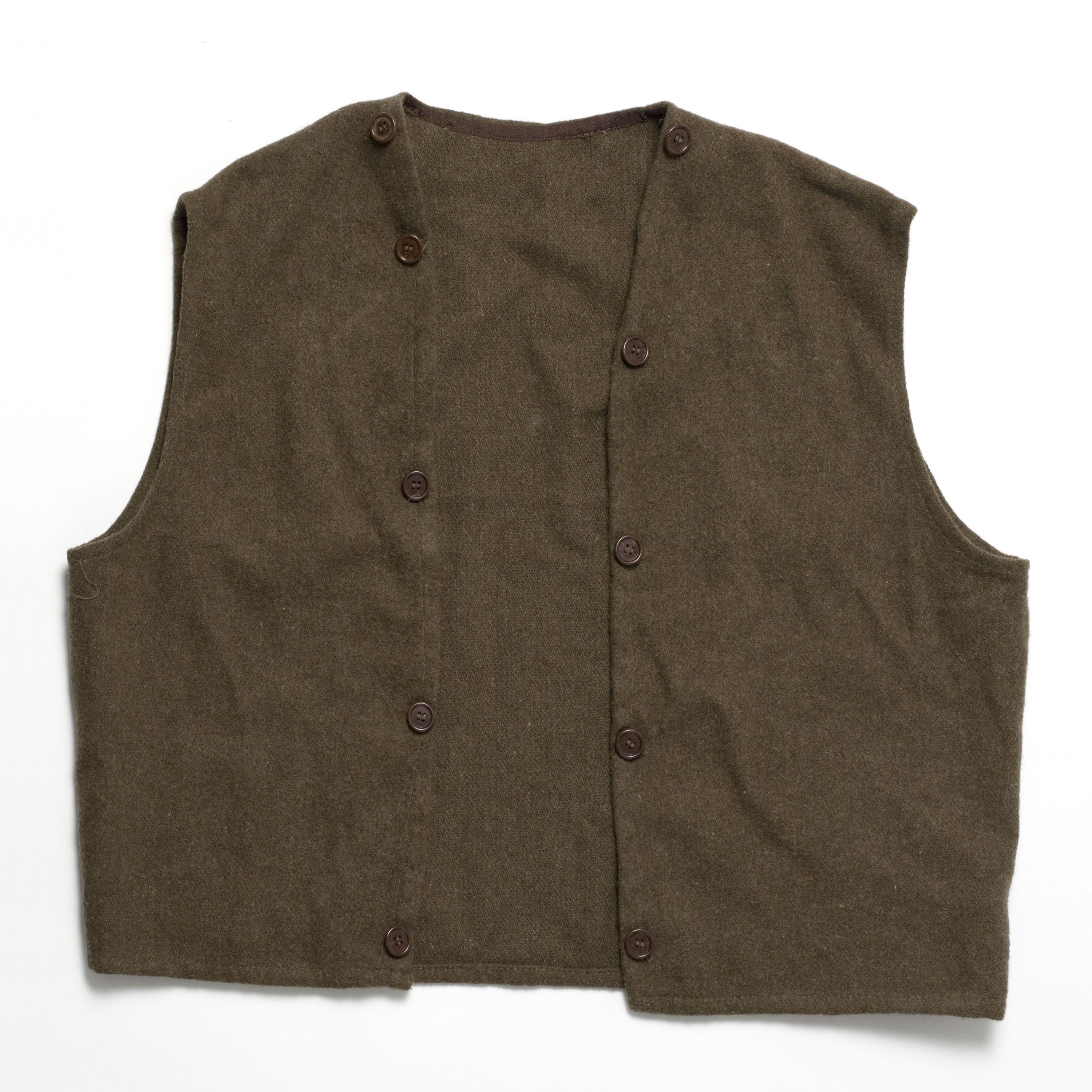 Elle a l'apparence d'un gilet sans manche, douze boutons marron permettent de la fermer sur l'avant, petit jonc de bordure et renfort en tissu marron sur l'avant et le cou.