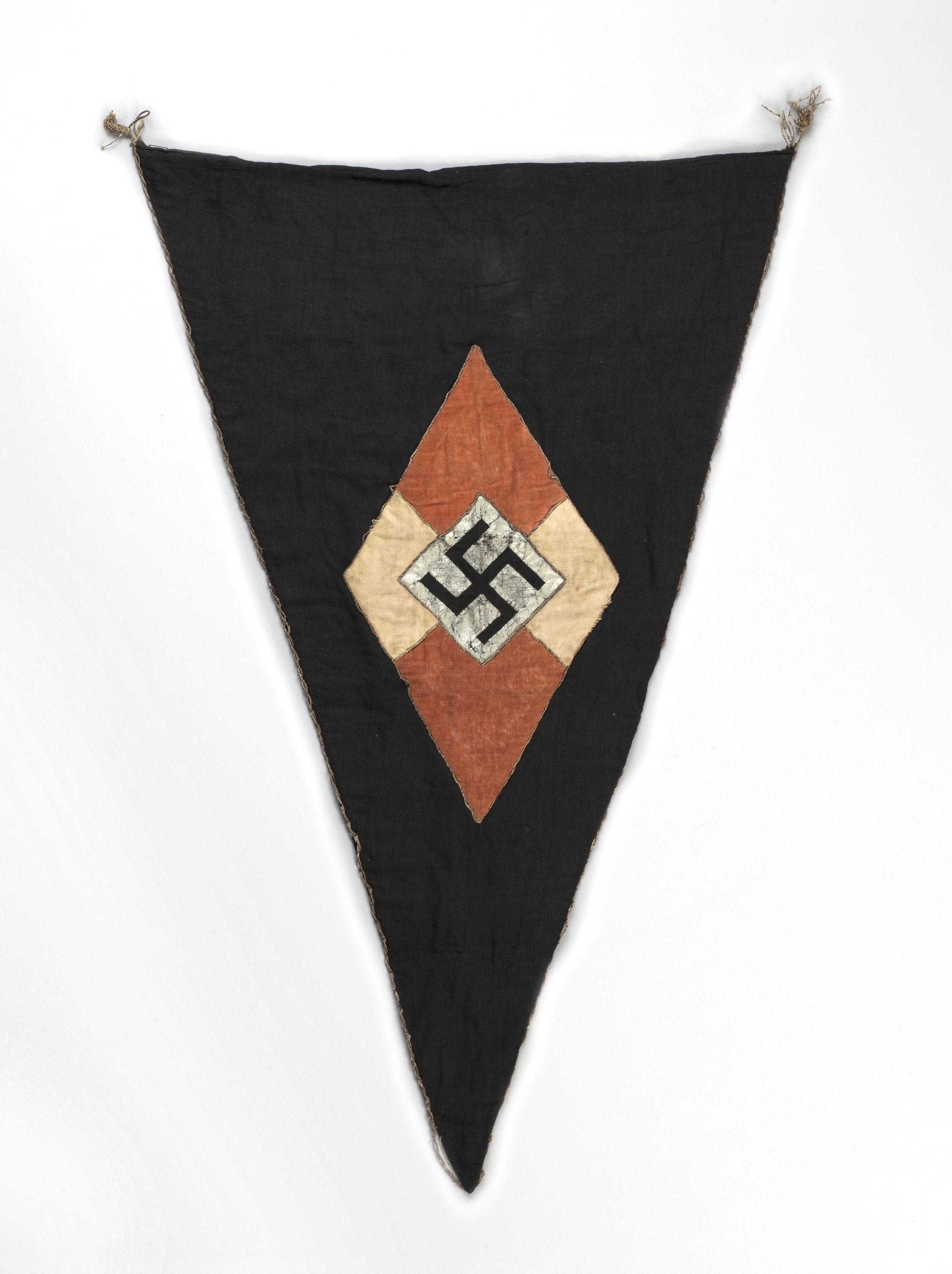 De forme triangulaire et de couleur noire, avers avec lettres brodées blanches soulignées d'un fil de cannetille argentée, deux runes argentées (peinture en partie disparue), soulignées d'un fil de cannetille argentée, les deux plus longs côtés sont également soulignés d'un fil de cannetille argentée. Revers : insigne en losange de la HJ, losanges rouges et blancs en velours, croix gammée noire du drapeau ressortant grâce à de la peinture argentée ; les différents éléments sont soulignés d'un fil de cannetille argentée. Les extrémités de ce fil formaient deux boucles d'attache du côté le plus petit du fanion (l'une est coupée).