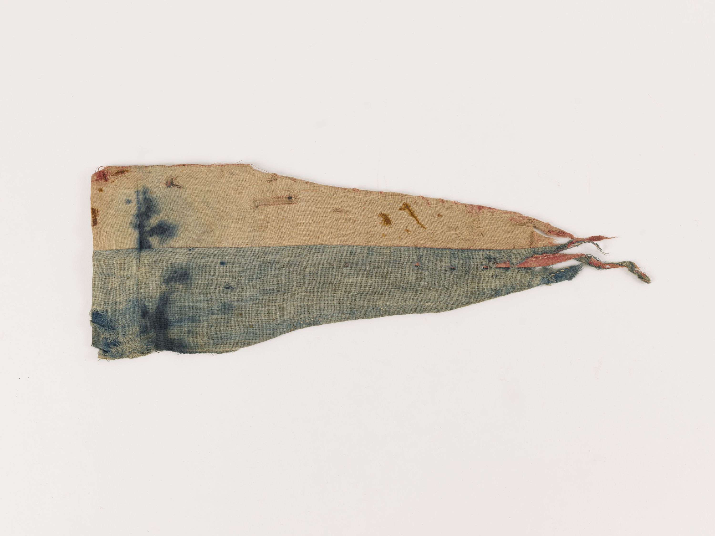 En forme de triangle isocèle, couleurs bleues et rouges superposées de manière horizontale, passage pour une hampe.