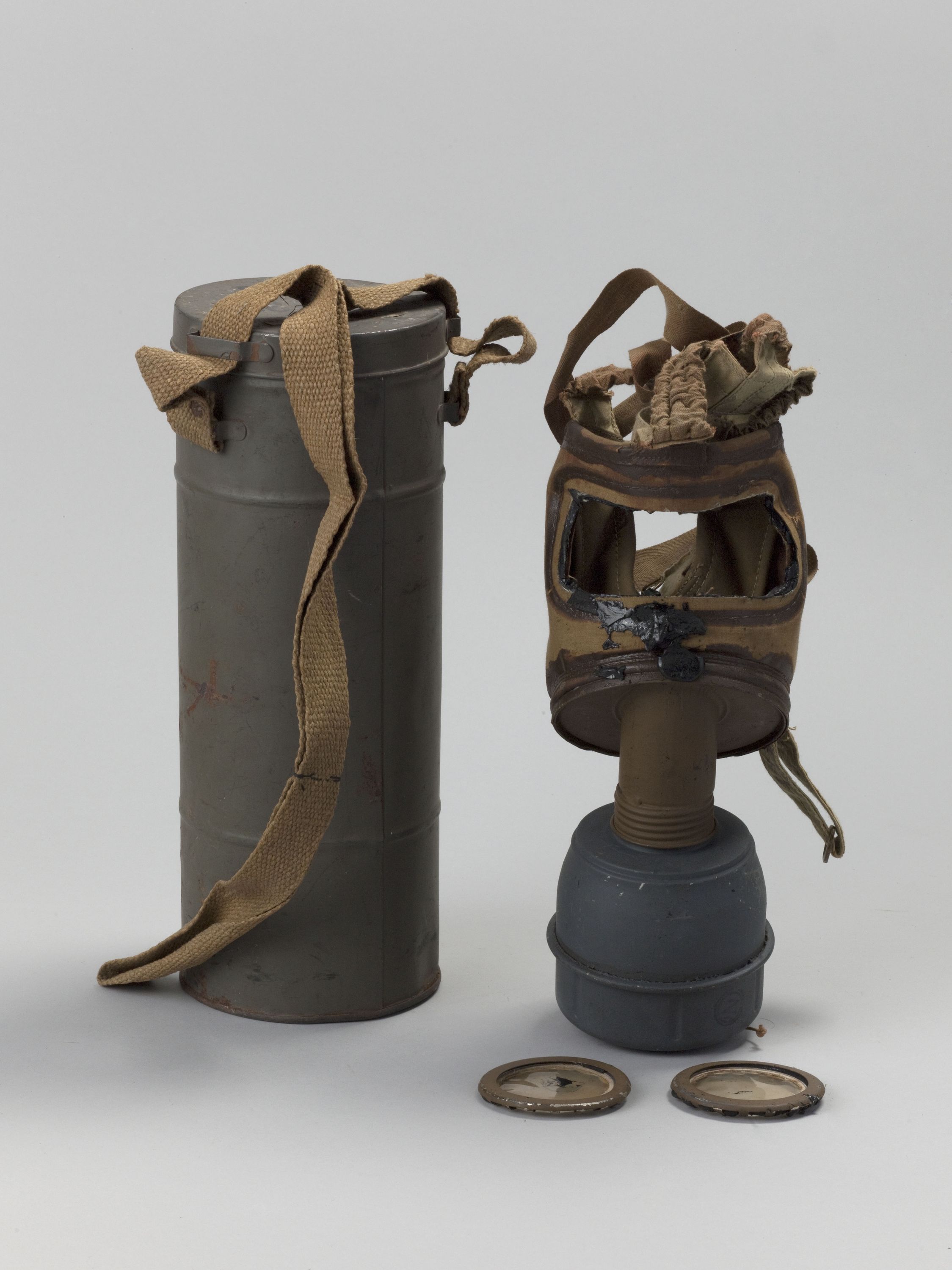 Avec son étui cylindrique métallique muni d'une sangle en fibres, cartouche grise, masque en toile et caoutchouc.