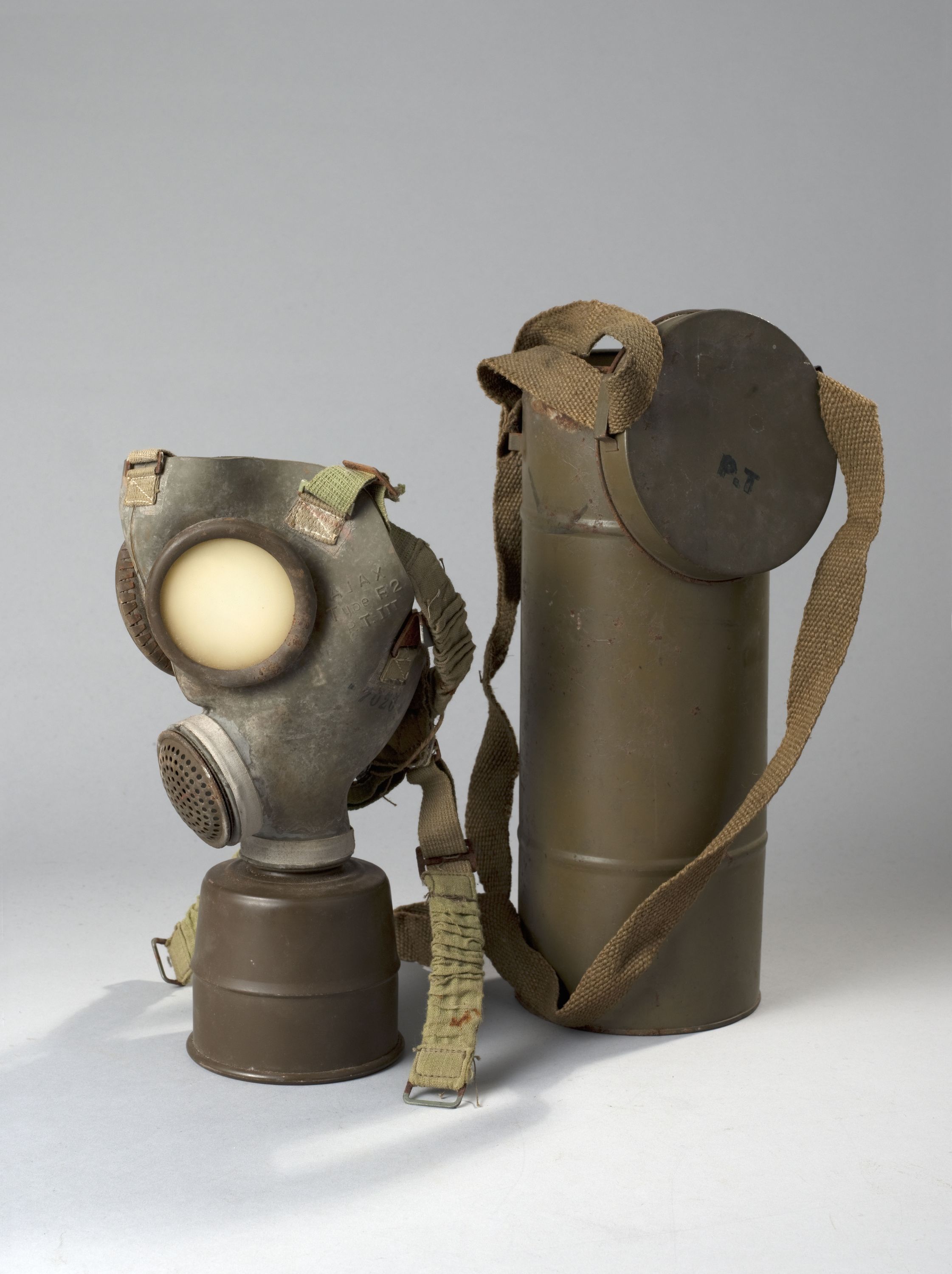 "Masque à gaz" civil de la DP (française), avec son étui cylindrique métallique peint en kaki, et sa sangle de toile, maintenue par deux rivets pour chacune des deux attaches de la boîte. Masque proprement dit en matière plastique grise, différents marquages. Plomb fixé sur les sangles de l'arrière de la tête, cartouche kakie avec un bouchon en caoutchouc sur le dessous.