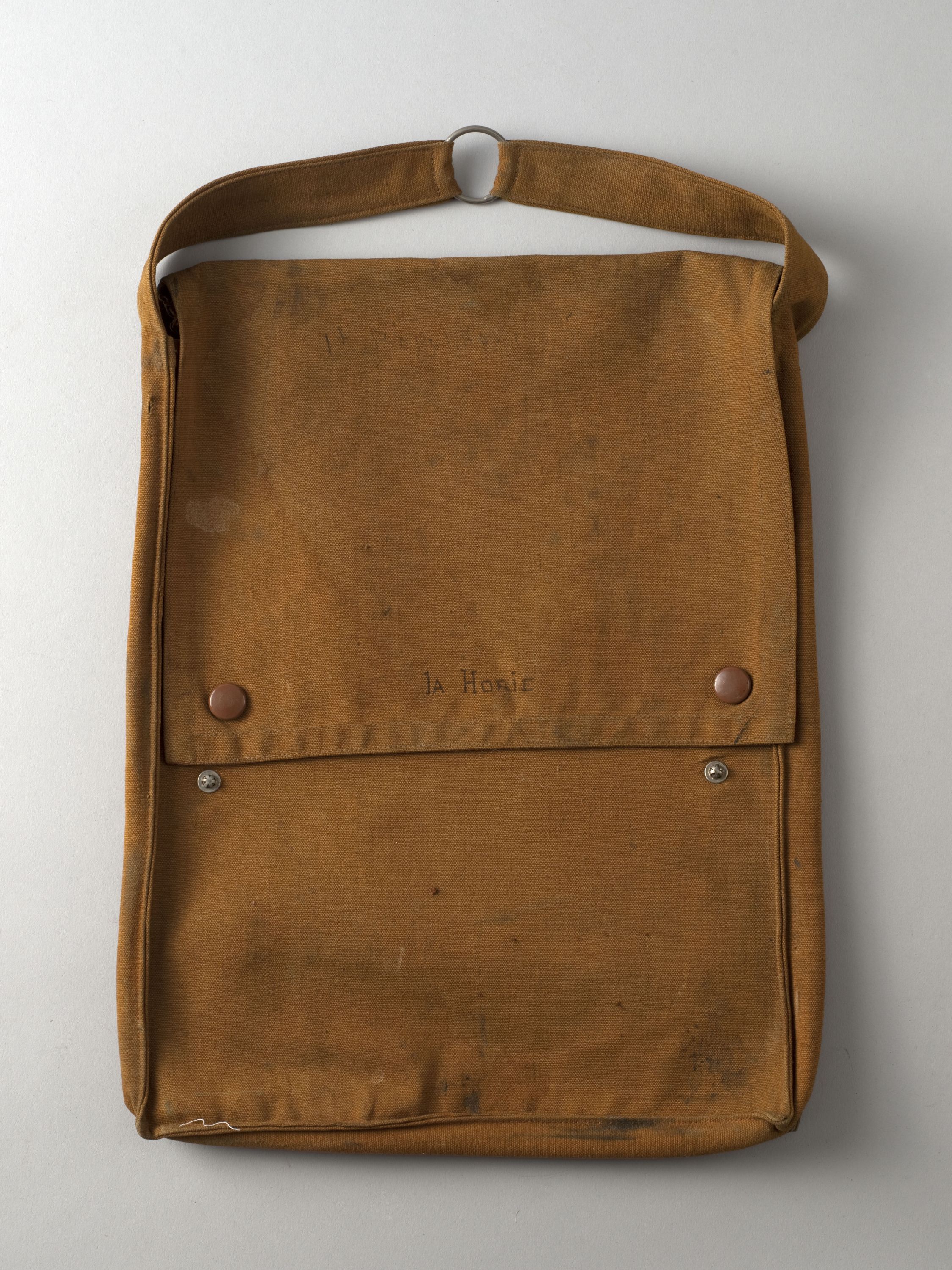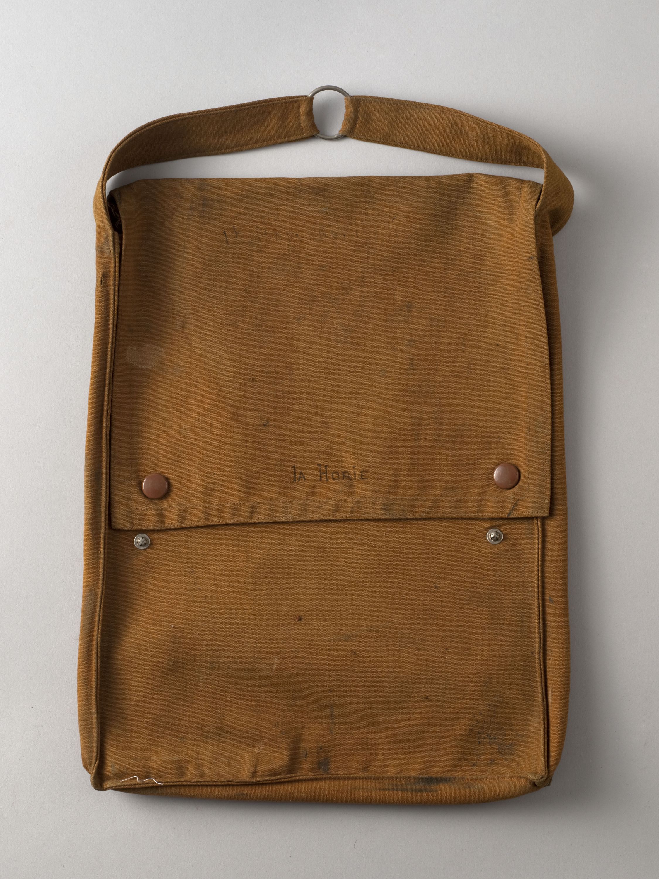 Fabrication locale ou civile, paramilitaire (non réglementaire dans l'armée française) : pochette rectangulaire en toile cachou, deux boutons-pressions, sangle de transport en toile avec un anneau métallique (deux éléments métalliques retenus à ce dernier par un cordonnet rougeâtre, au travers d'un orifice).