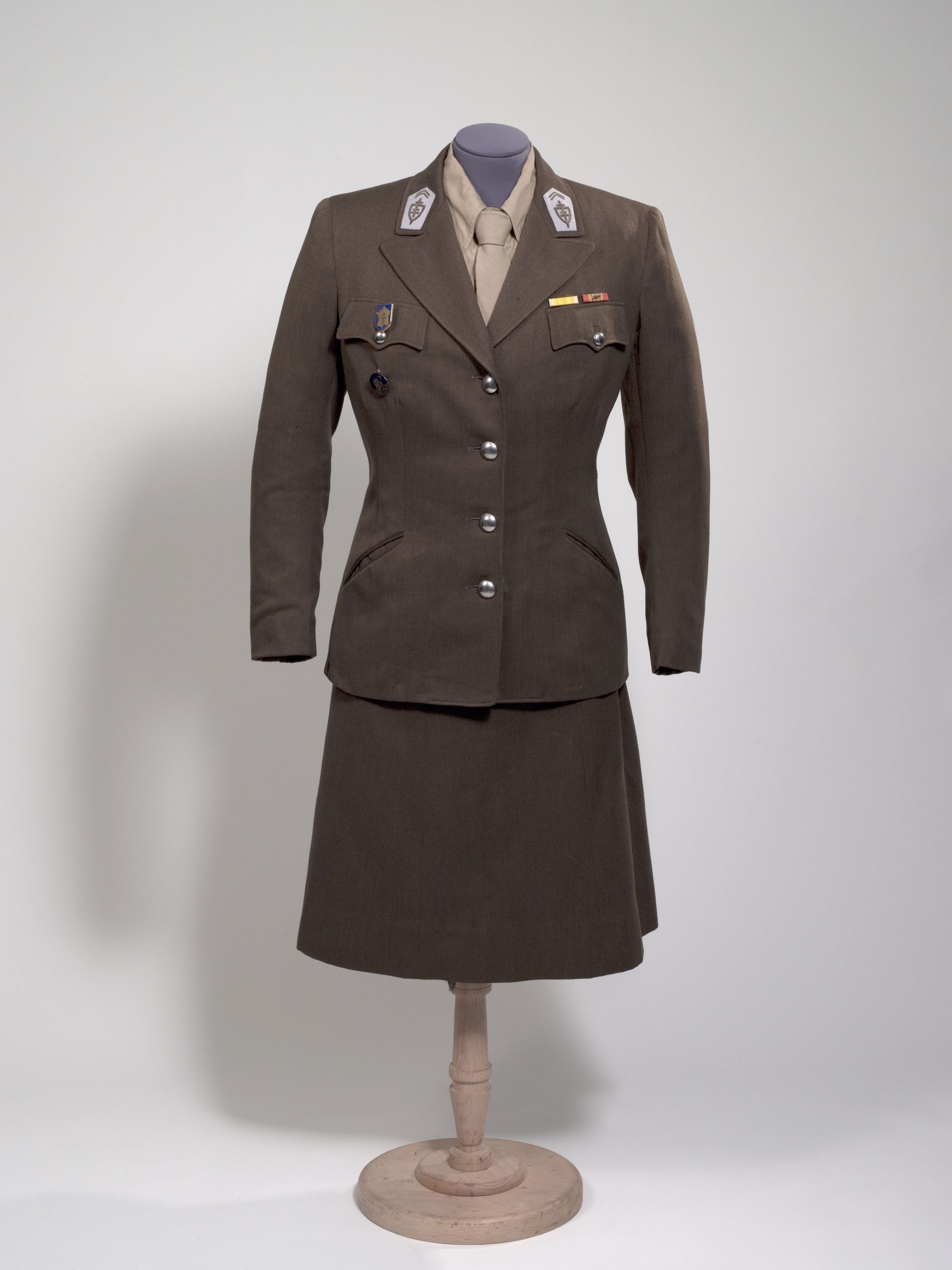 Vareuse à col ouvert pour personnel féminin, pattes de collet bleu ciel de chef de section du train (comportant une croix de Lorraine dans un écu, brochant sur une épée surmontée de deux chevrons, brodés en cannetille d'argent ; la lame de l'épée et la partie verticale de la croix se confondant), deux fausses poches de poitrine, rabats à plis watteau, deux poches sur les hanches, fendues, en diagonale. Doublure en satinette, quatre boutons nickelés sur le devant. Insigne du groupe Rochambeau épinglé sous la poche de poitrine gauche (MLM2002.1489) ; au dessus : barrette de la Médaille Militaire et de la croix de guerre 1939-45. Refrappe d'un insigne de la 2ème DB épinglé en dessous de la poche de poitrine droite.